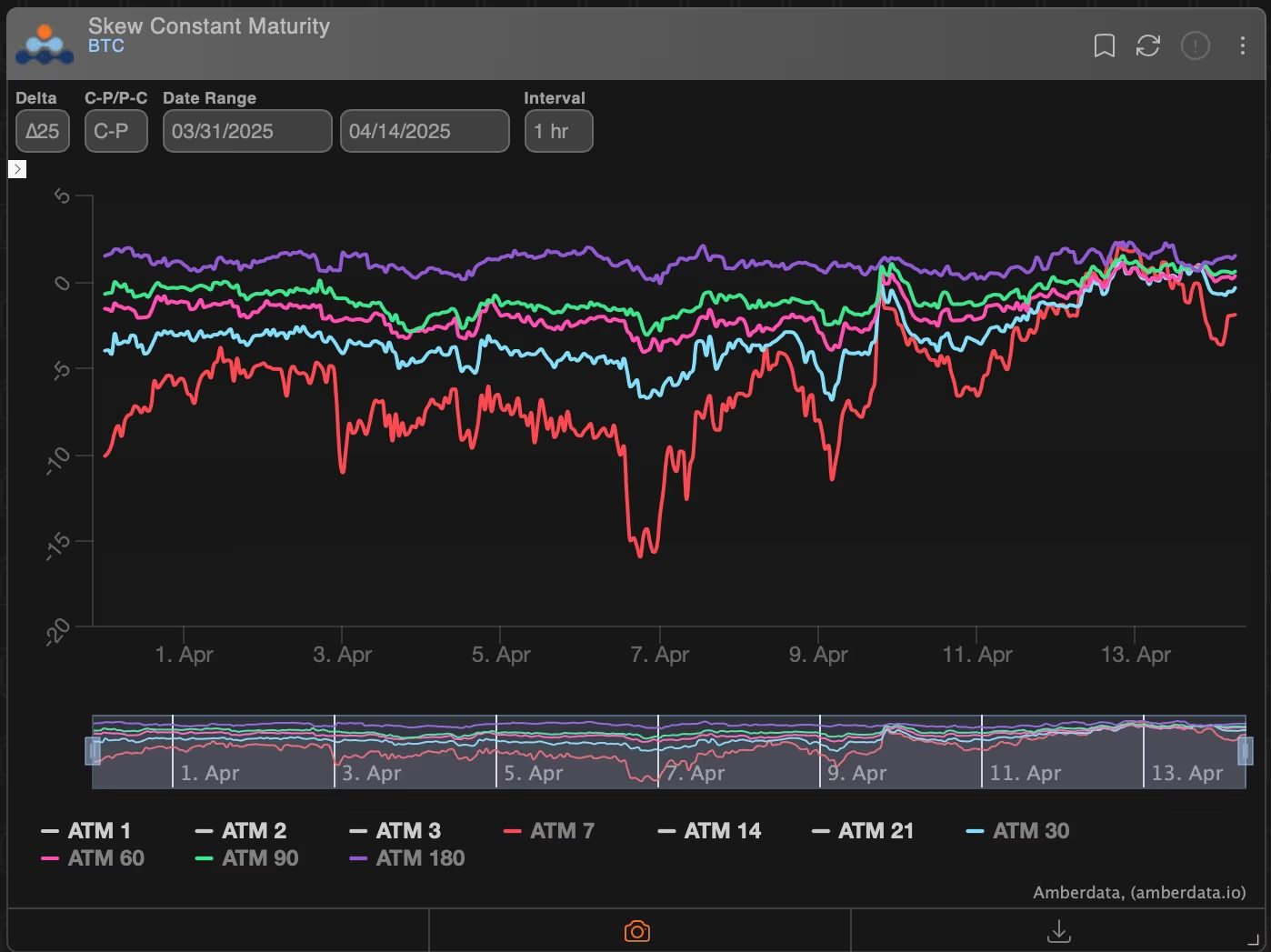 الانحراف في خيارات 30 و60 و90 يومًا ارتفع فوق الصفر، ما يشير إلى تطبيع في المزاج العام بعد موجة الذعر الأخيرة. أما انحراف السبعة أيام، ورغم بقائه سلبيًا، إلا أن حدّته تراجعت بشكل ملحوظ مقارنة بما كانت عليه (-14%) في بداية الأسبوع.