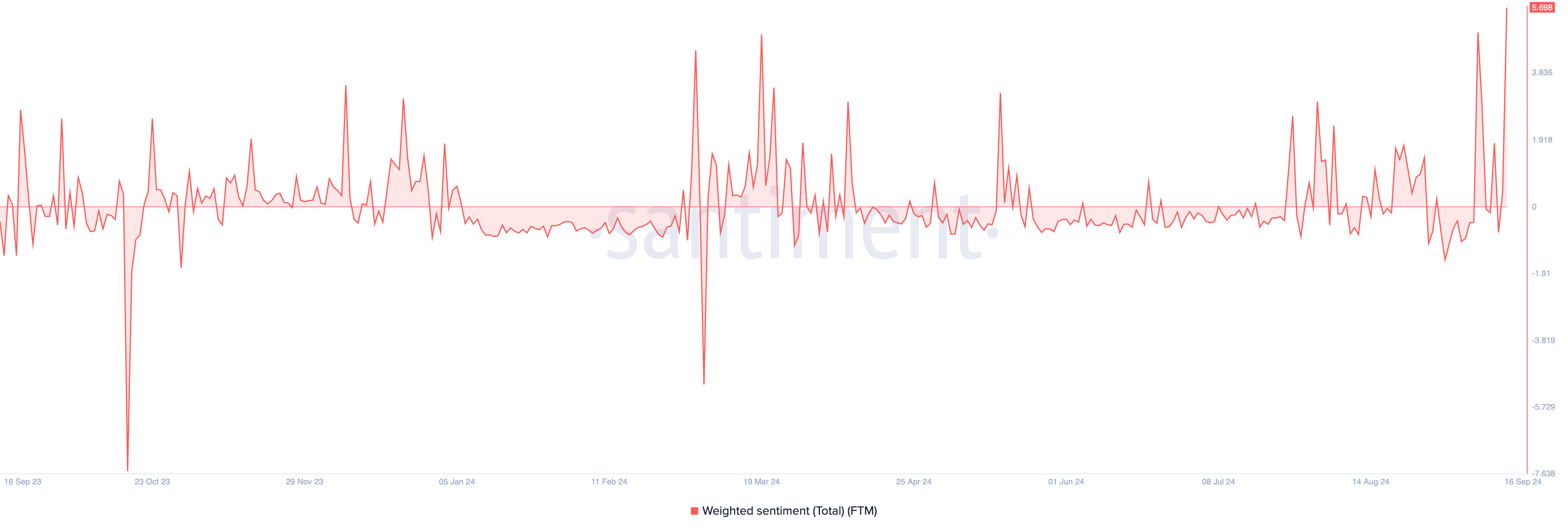 بالإضافة إلى ذلك، ارتفع المؤشر الوزني لمشاعر FTM، الذي يعكس مزاج السوق تجاه الأصل، إلى أعلى مستوياته منذ مارس 2023. حاليًا، يبلغ المؤشر الوزني لمشاعر FTM 5,69، مما يشير إلى أن النقاشات على وسائل التواصل الاجتماعي حول العملة البديلة إيجابية في معظمها.