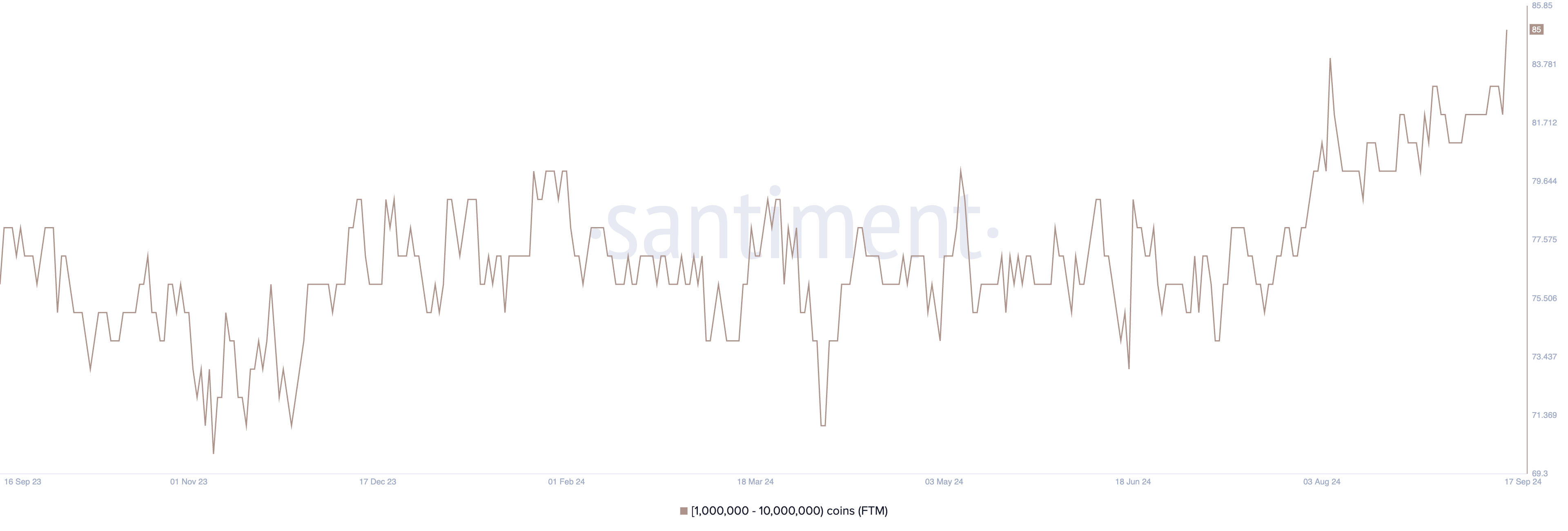 منذ أن بدأت شبكة الاختبار الصوتية في 6 سبتمبر، كان هناك زيادة ملحوظة في نشاط الحيتان. وفقًا لـ Santiment، نمت نسبة عناوين الحيتان التي تحتفظ بين 1,000,000 و10,000,000 عملة FTM بنسبة 5%، مما يشير إلى أن الحاملين الكبار يتجمعون استعدادًا لإطلاق الشبكة الرئيسية.