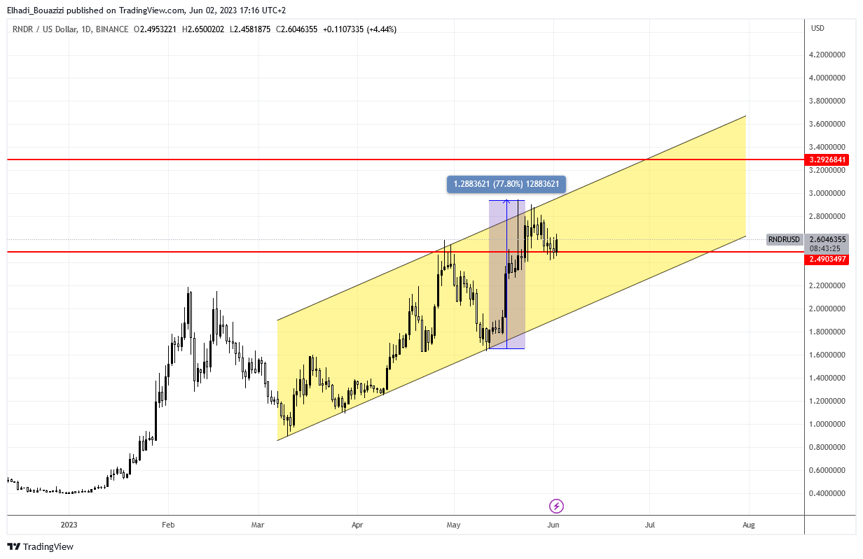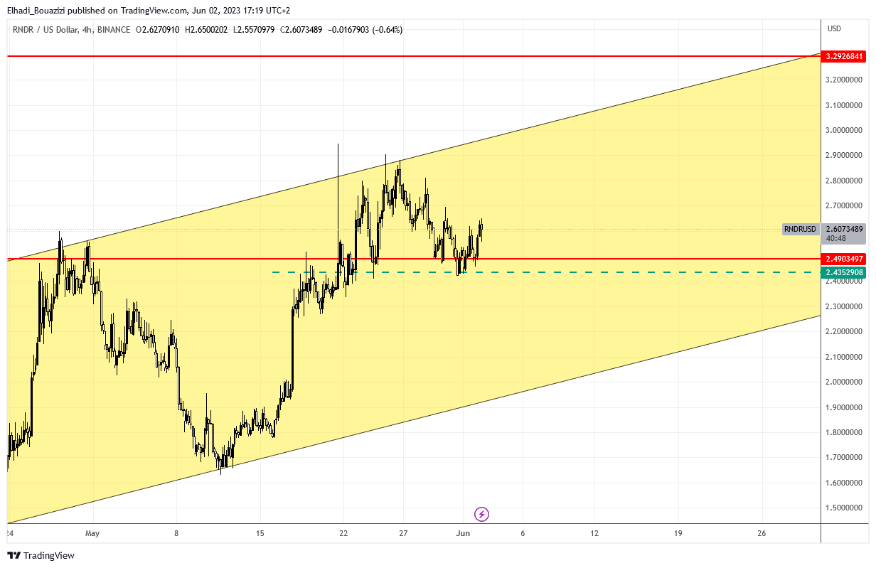 في موجة الارتفاع الأخير تمكن سعر راندر RNDR  من اختراق مستوى المقاومة 2.50 دولار. الذي تحول الآن إلى مستوى دعم قوي. السعر الآن في وقت كتابة هذا التقرير يبلغ 2.60 دولار.