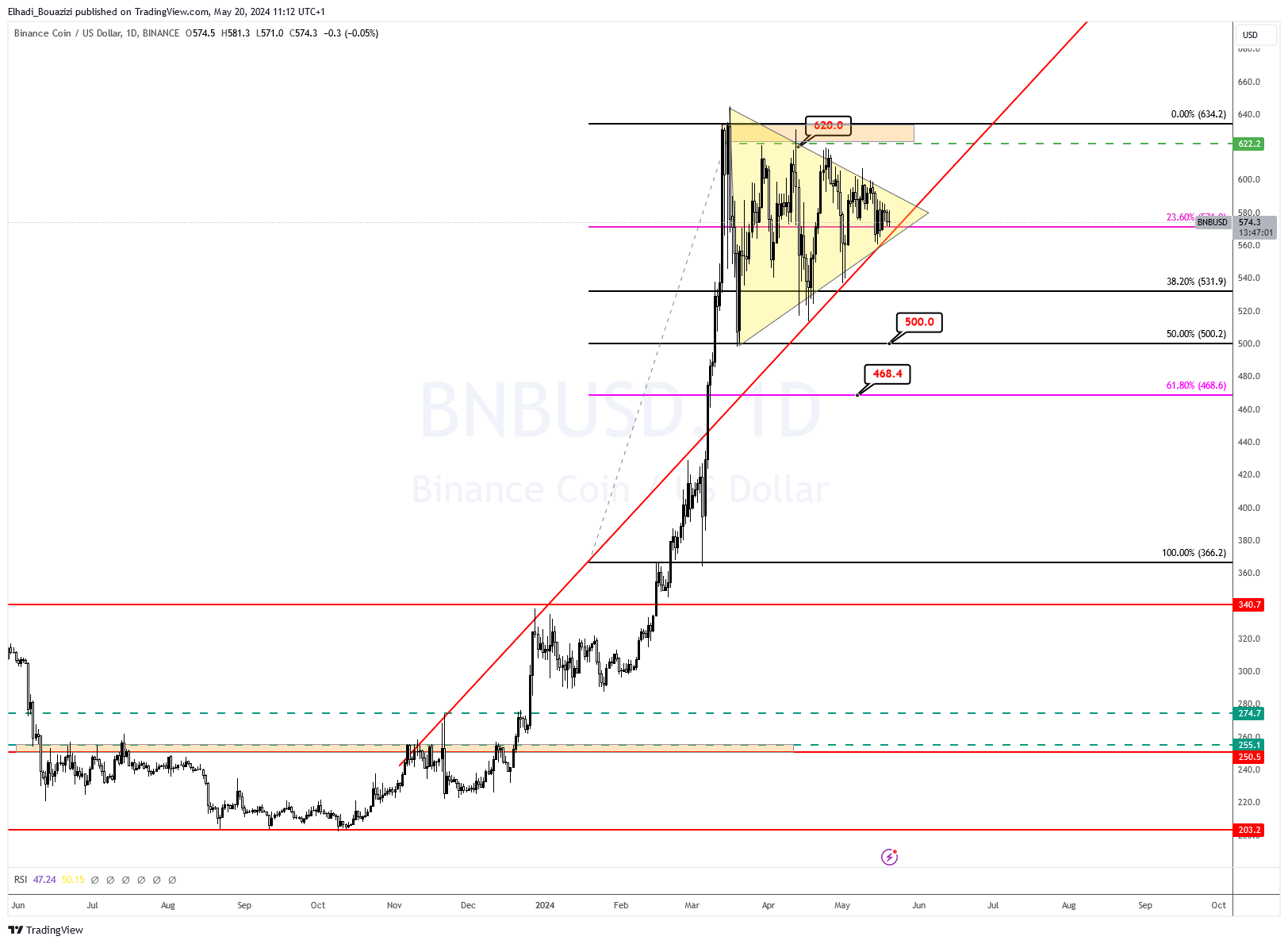 كما أن سعر BNB يختبر حاليا خط الاتجاه الصاعد عند سعر 570 دولار، الذي ارتد منه مرتين في السابق.