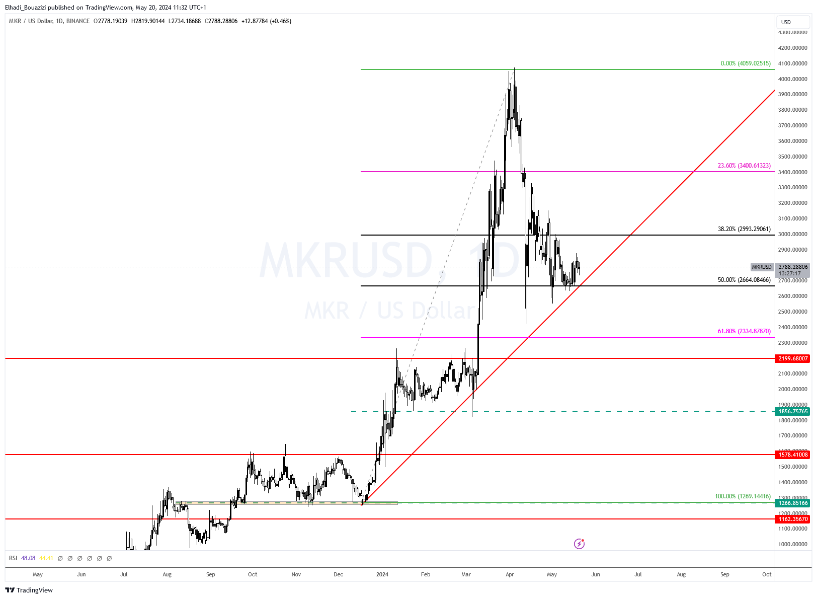 • عملة MKR تلامس مستوى دعم قوي عند 2700-2750 دولار، مما يشكل فرصة شراء.