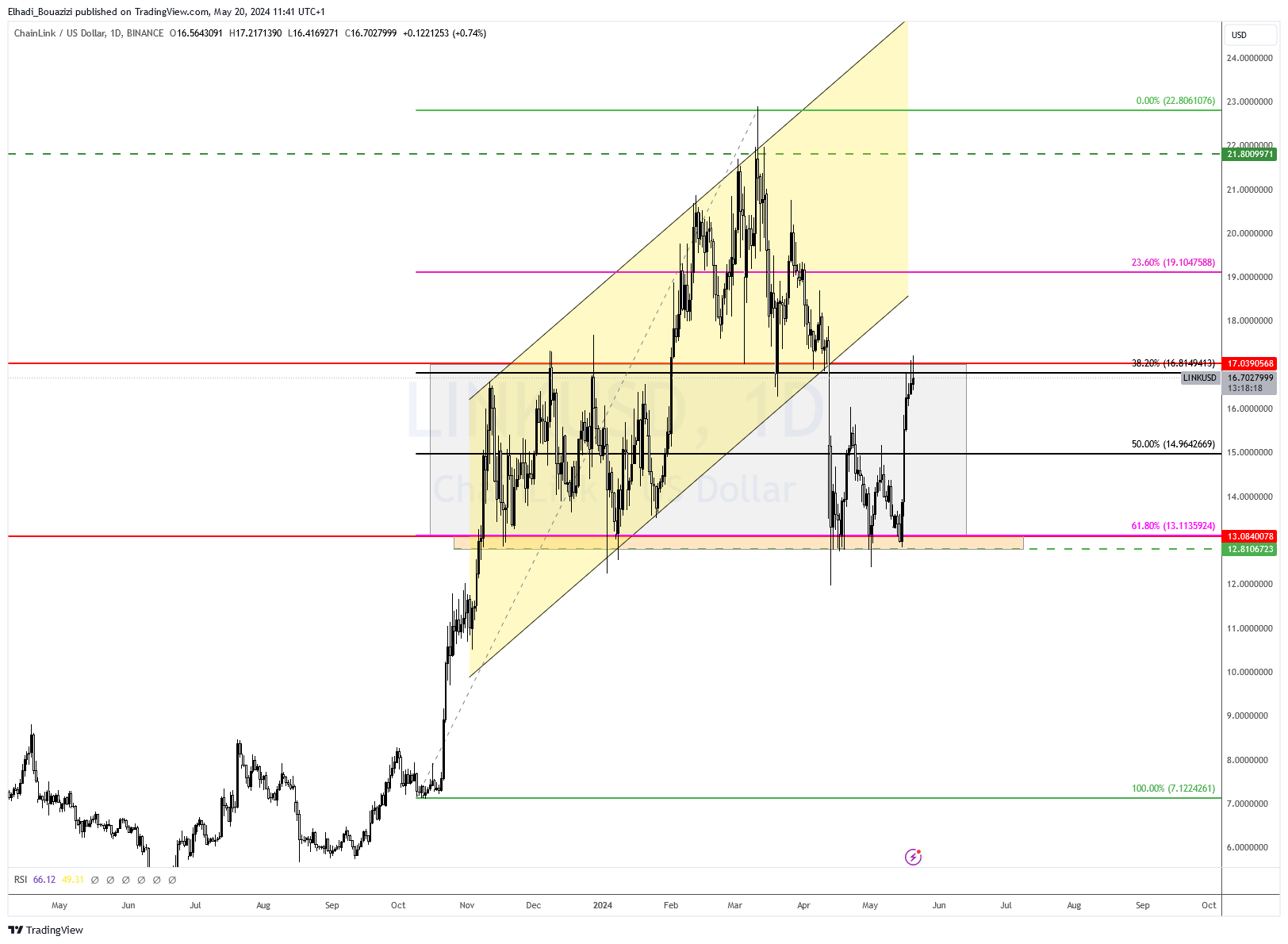 على الرسم البياني اليومي، سعر عملة LINK يتداول داخل قنوات سعرية عرضية محصورة بين 13 – 17 دولار التي تمثلان تصحيحات فيبوناتشي 61.8 – 38.2 على التوالي.