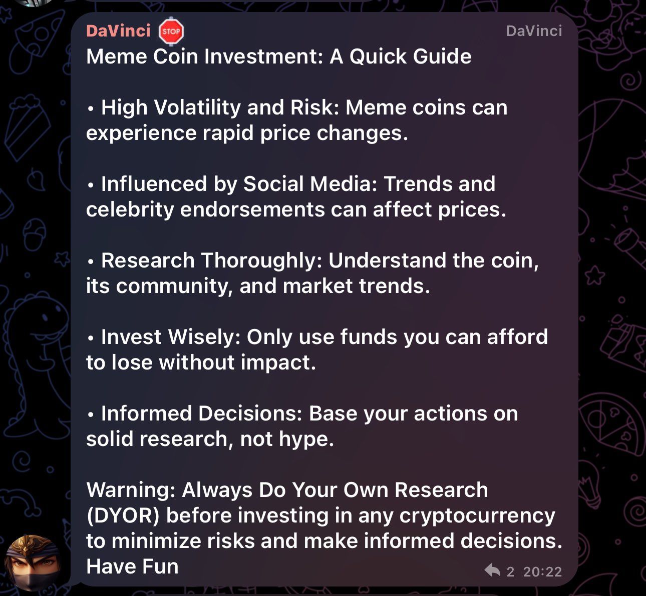 ومع التأكيد على ضرورة تخفيف المخاطر، شدد الفريق على أهمية استخدام الأموال غير الأساسية فقط للاستثمار في عملات الميم. كما أكدوا على أهمية الاستثمار المسؤول، حيث حثوا المستثمرين على اتخاذ قراراتهم بناءً على بحوث صلبة بدلاً من ضجيج السوق.