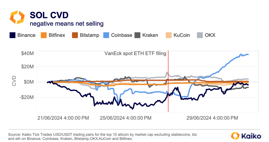 انعكس هذا التحول المؤقت في بيانات حجم التداول التراكمي لسولانا (CVD)، التي تقيس صافي الشراء والبيع للعملات المشفرة. وفقًا لكايكو، سجلت SOL صافي CVD إيجابيًا بقيمة 29 مليون دولار خلال الأسبوع الماضي، مدفوعًا أساسًا بزيادة الشراء الفوري على كوين بيس.