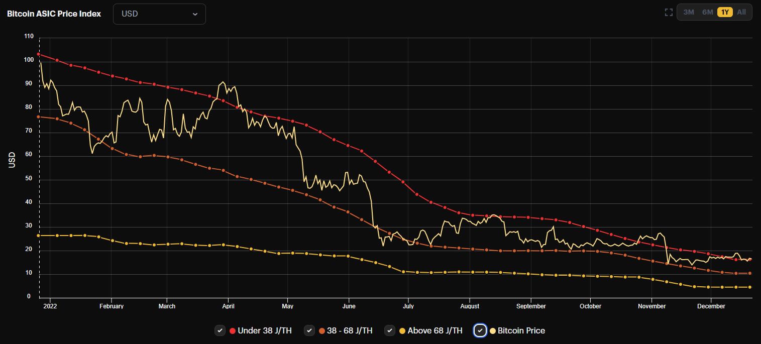 وبحسب مؤشر Hashrate فقد انخفضت ايضا أسعار جهاز ASIC في عام 2022 بالتزامن مع انخفاض أسعار البتكوين لتكن الانخفاضات أكثر حدة مع الارتفاع في استخدام الطاقة، كما يعكس مؤشر أسعار ASIC السعر في الفترة الحالية لكل تراهاش لأجهزة تعدين البتكوين المختلفة طبقاً لثلاث مستويات من الكفاءة.
