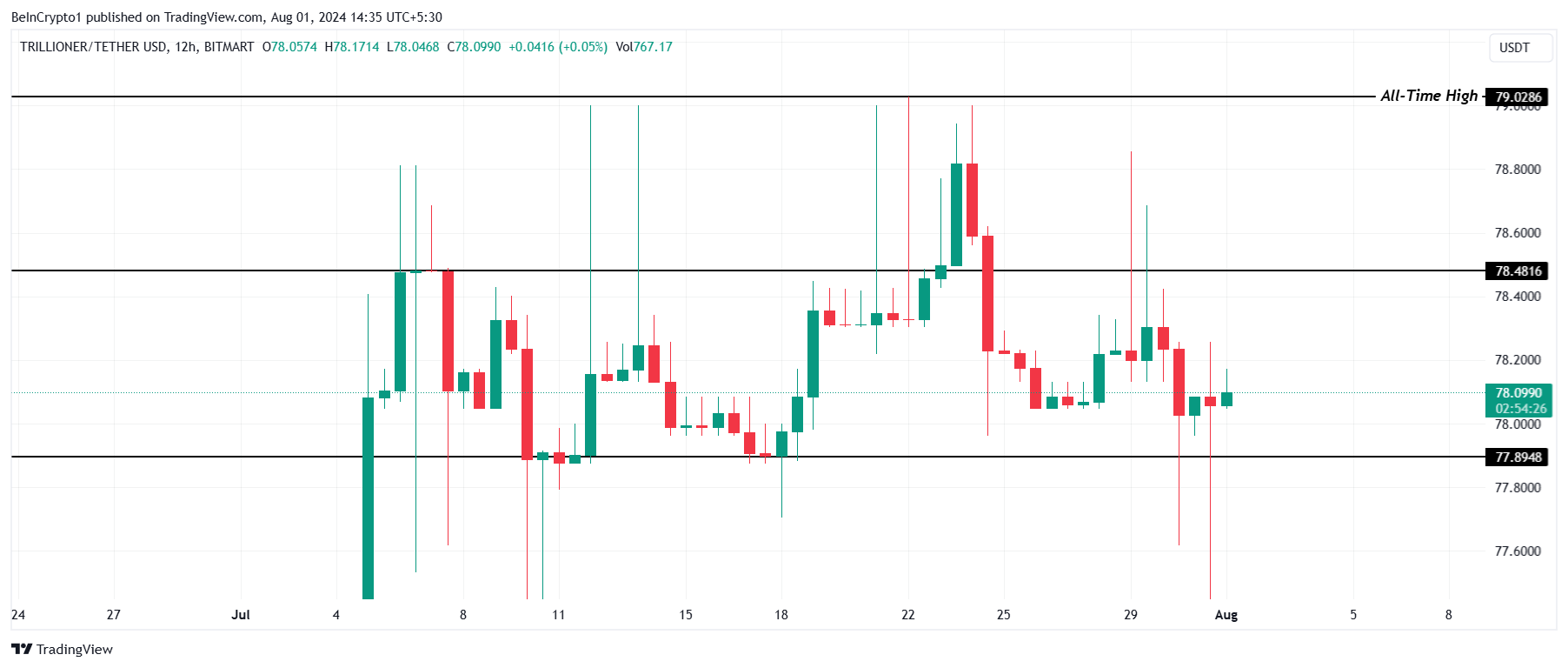 إذا تم إبطال الدعم عند 77,89 دولار، فقد يلاحظ سعر TLC انخفاضًا كبيرًا. إذا تم اختراق أعلى مستوى على الإطلاق البالغ 79,02 دولار، فقد يبدأ تجمع أكبر، مما يبطل الفرضية الهبوطية.