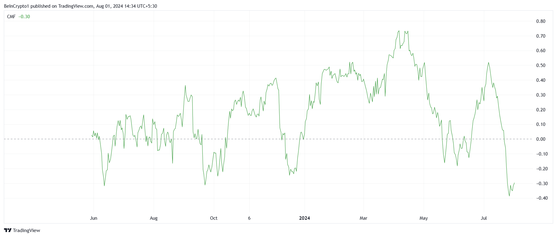 الأصل الرقمي لم يظهر نموًا يذكر منذ منتصف يونيو، والآن يدرك المستثمرون قلة القيمة التي يحملها TLC. بسبب ذلك، وصلت التدفقات الخارجة المحيطة بالعملة البديلة إلى أعلى مستوى على الإطلاق، كما هو موضح في تدفق الأموال تشايكين (CMF).