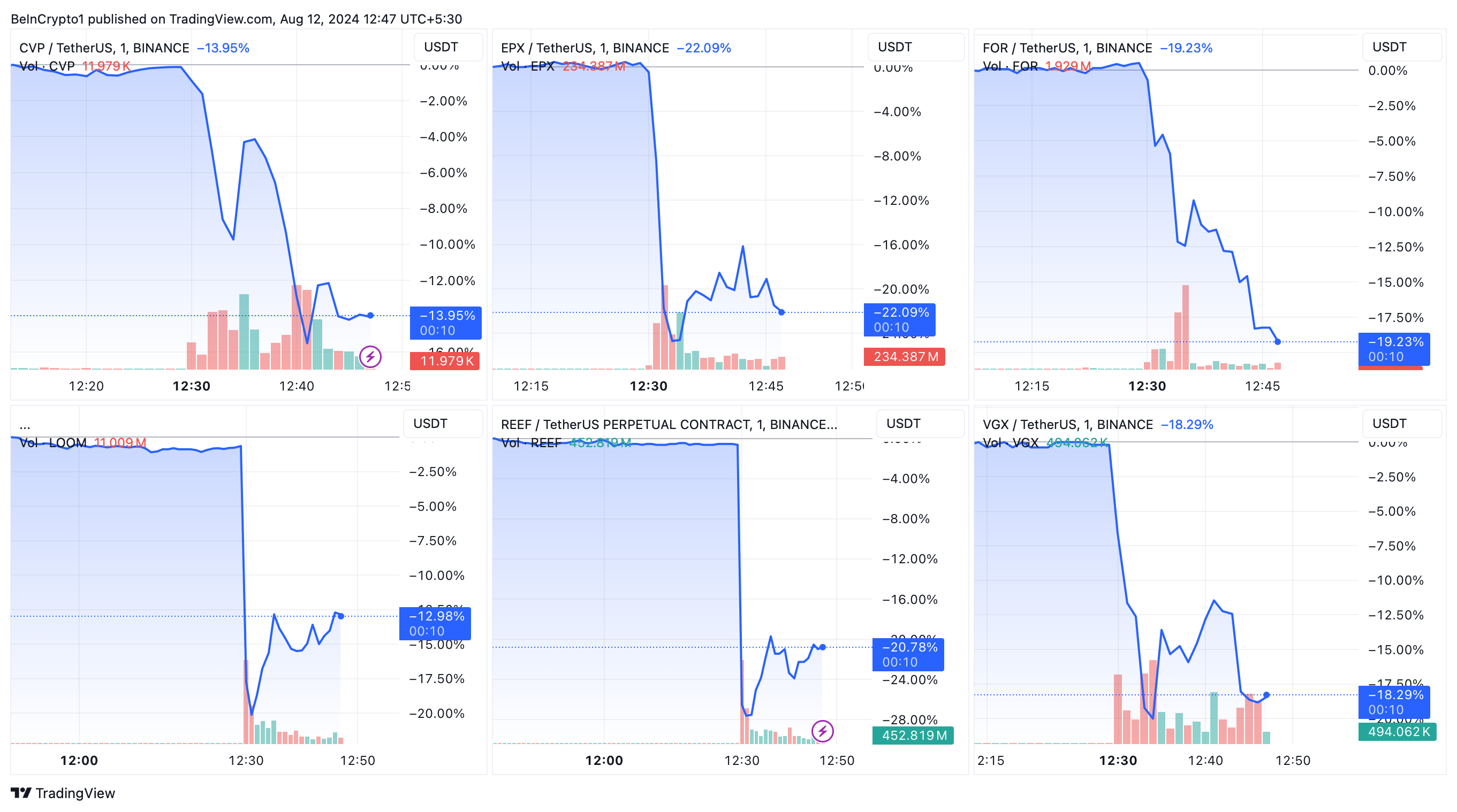 كانت تأثيرات الأسعار فورية وكبيرة. انخفضت CVP بنحو 14%، وانخفضت EPX بنسبة 22%، وFOR بنحو 20%، وLOOM بنحو 13%، وREEF بأكثر من 20%، وVGX بحوالي 18%. تعكس هذه الانخفاضات الحادة حساسية السوق لإزالة العملات من المنصات، والتي غالباً ما تعمل كمؤشر لجدوى الرمز المتصورة.