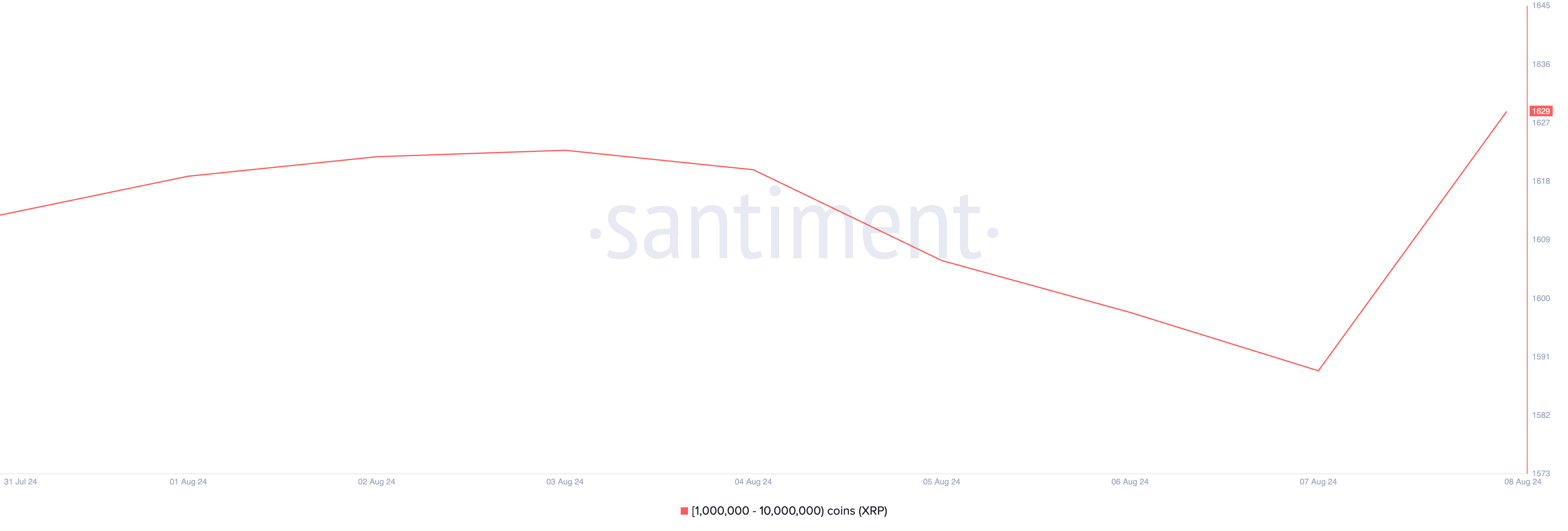 علاوة على ذلك، زادت حيتان XRP من تجميع الرموز خلال الـ24 ساعة الماضية. وفقًا لبيانات Santiment، ارتفع عدد حيتان الريبل التي تحتفظ بين 1,000,000 و10,000,000 رمز بنسبة 2% خلال تلك الفترة.