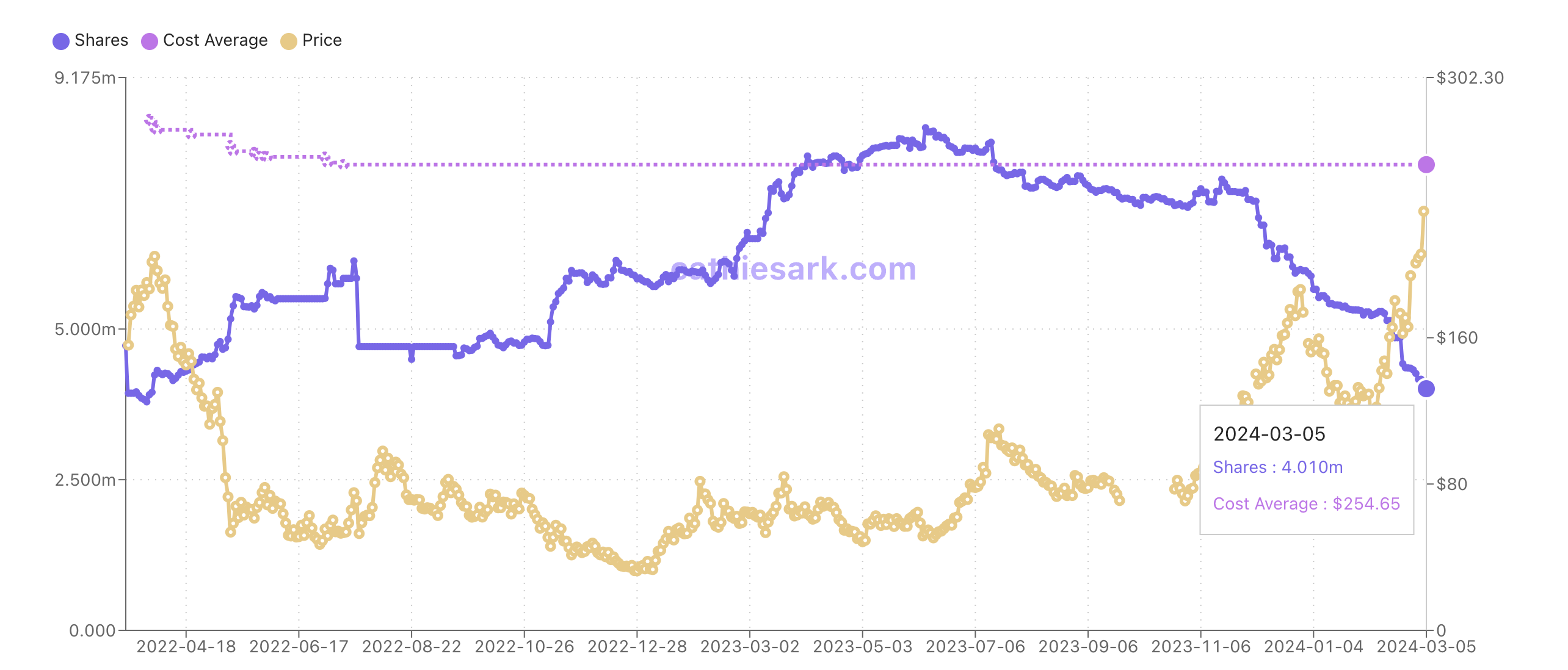 استجابةً للاتجاه الصعودي للسوق، بدأت وود في تخفيض حصتها في كوين بيس. على وجه التحديد، انخفضت حيازة ARKKK من أسهم كوين بيس إلى النصف تقريبًا منذ أكتوبر 2023. امتلكت ETF ما يقرب من 7 ملايين سهم في أكتوبر 2023.