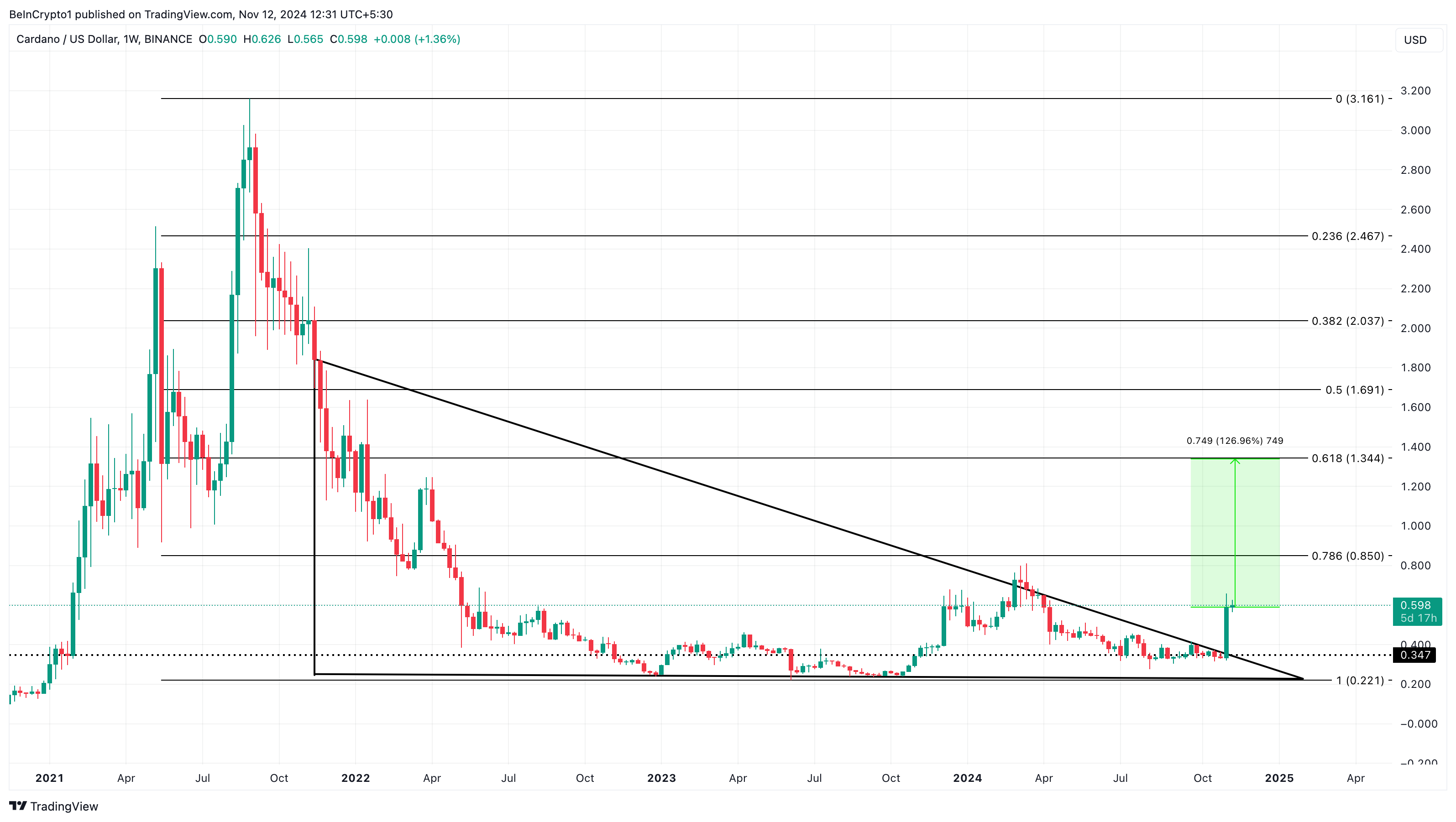 • يُظهر مخطط ADA انفراجًا من مثلث هابط، مما يُشير إلى إمكانية الوصول إلى 0.70 دولار وربما 1.34 دولار في عام 2025.