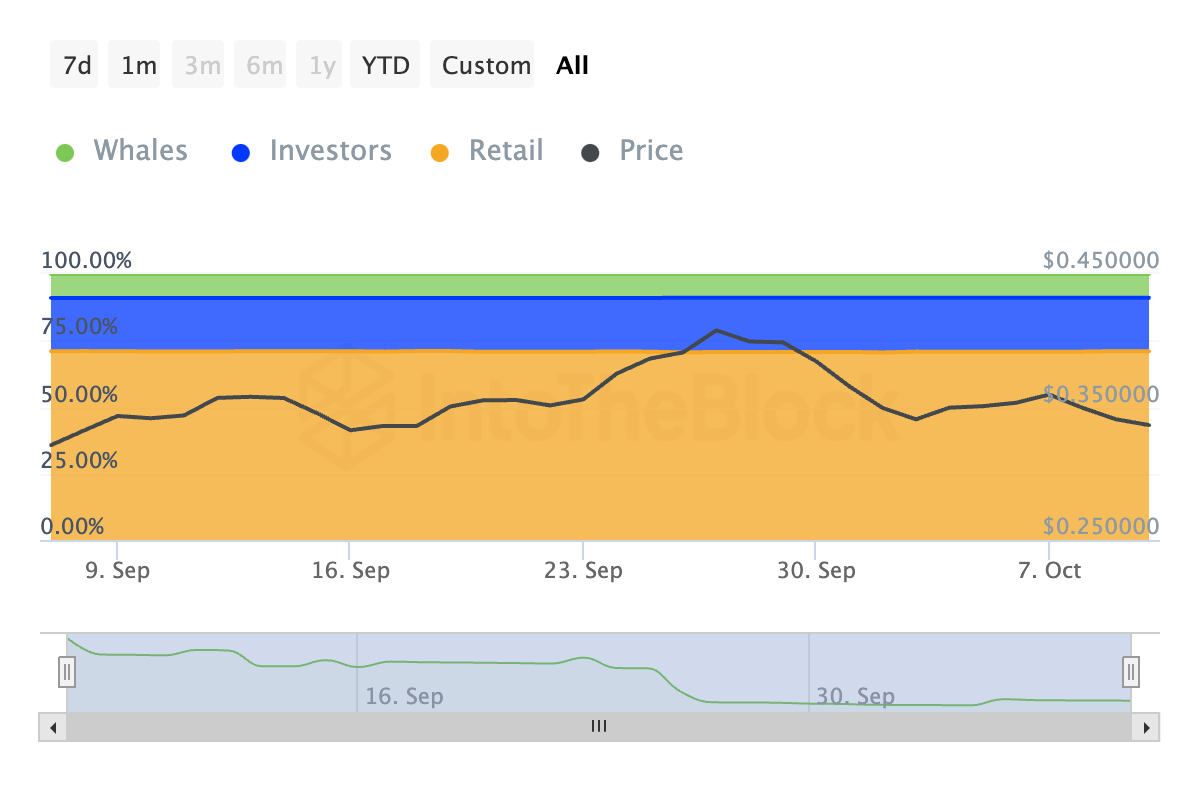 من المثير للاهتمام، خلال نفس الفترة، شهد المتداولون التجزئة زيادة في حصتهم من معروض ADA بنسبة 0,27%. ومع ذلك، هذا ليس إيجابياً صافياً لـ ADA.