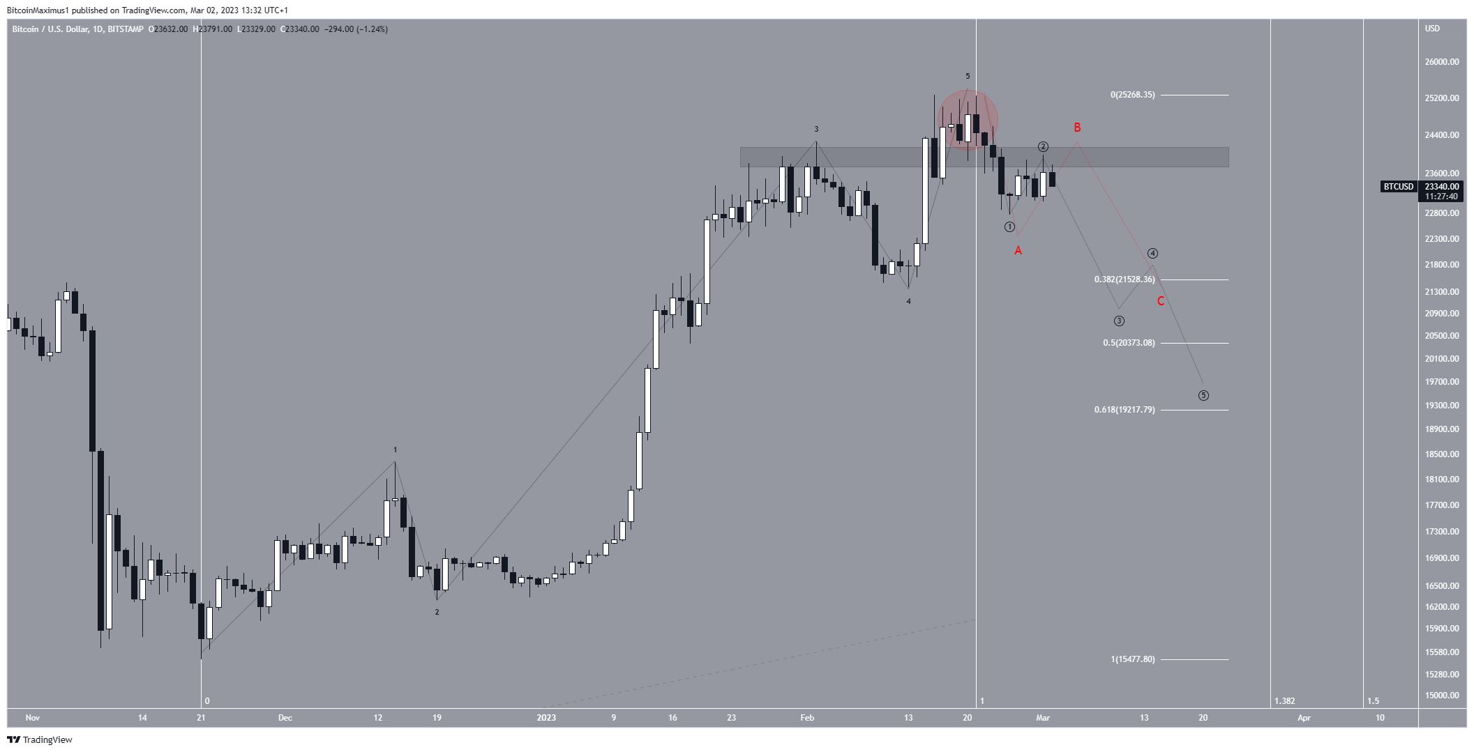 ويتوقع الخبراء في شهر مارس، انخفاض سعر بيتكوين إلى منطقة دعم تصحيح فيبوناتشي 0.382-0.618 عند 19.217 دولار و 21.582 دولار.