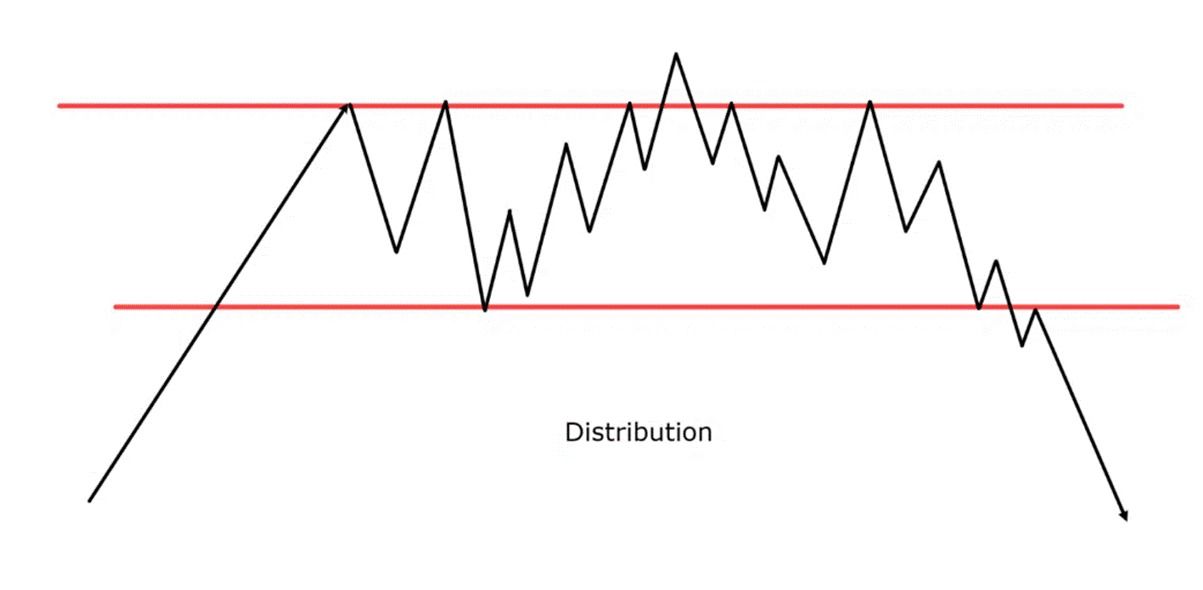 في مرحلة التوزيع، يبدأ المستثمرون الأذكياء ببيع ممتلكاتهم للجمهور. قد تكون الأسعار لا تزال قريبة من ذروتها، لكن حجم التداول يُظهر وضعًا مختلفًا، إذ يضعف زخم الشراء بينما يزداد ضغط المبيعات.