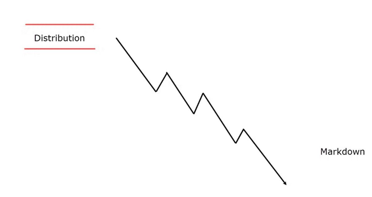 مرحلة تخفيض الأسعار تأتي بعد التوزيع. تنخفض الأسعار بشكل حاد مع تفوق البيع على الشراء.