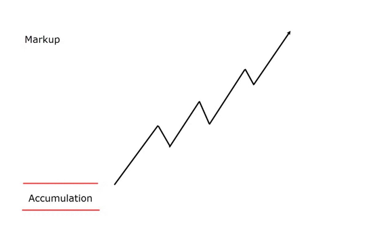 خلال مرحلة التراكم، تتحرك الأسعار بشكل جانبي ضمن نطاق ضيق، حيث يشتري المستثمرون المؤسسيون ("الأموال الذكية") الأصول من البائعين بهدوء. تتميز هذه المرحلة عادةً بانخفاض التقلبات، وانخفاض حجم التداول، وتقلبات طفيفة في الأسعار.