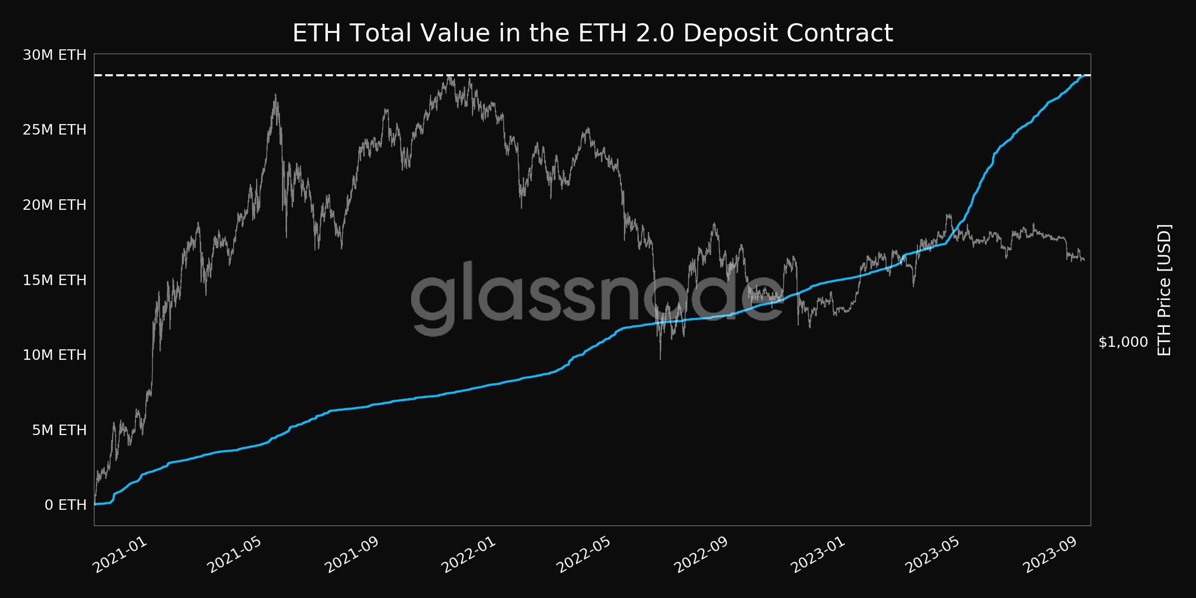 تمثل هذه الأرقام نسبة كبيرة تبلغ 23.8% من إجمالي عدد عملات ايثيريوم ETH المتداولة في السوق. المؤشر يشير إلى كمية عملة ايثيريوم ETH المرهون. من قبل المستثمرين والمقفولة في عقد إيثيريوم 2.0.