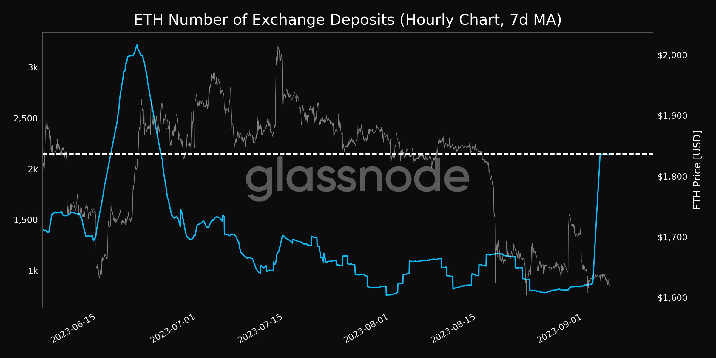 فحسب بيانات شركة Glassnode، فقد بلغ متوسط 7 أيام حجم ايثيريوم المودع في البورصات أعلى مستوى له في شهر عند مستوى 2,145 ETH.