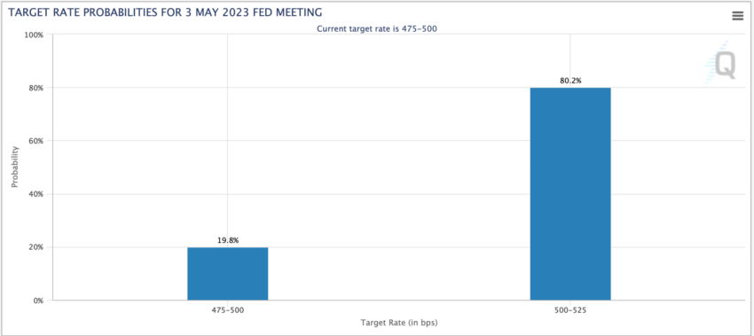 وبحسب مجموعة CME، توجد احتمالية بنسبة 80.2% برفع سعر الفائدة بمقدار 25 نقطة أساس خلال شهر مايو.