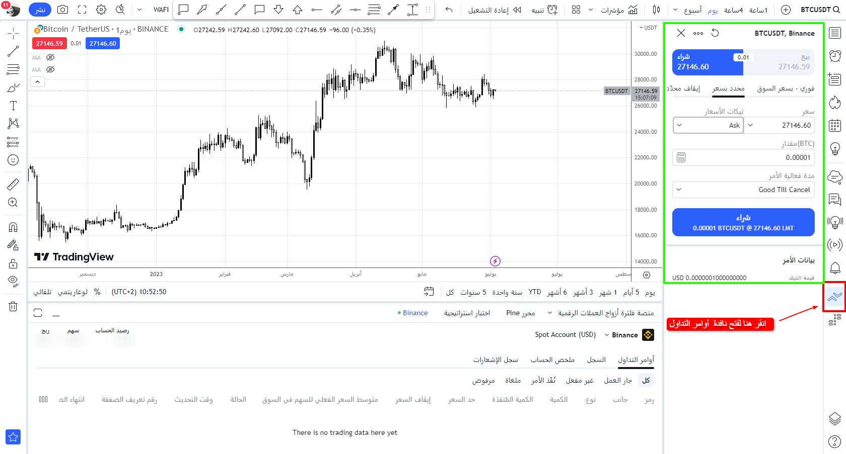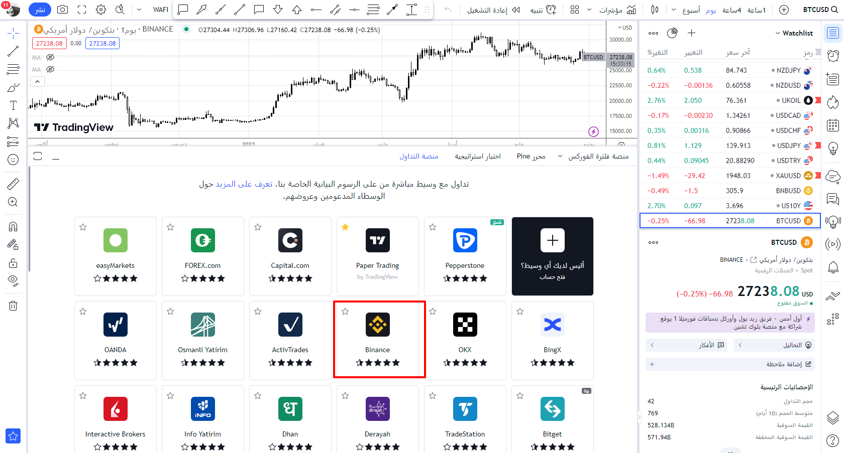 بعد تأكيد نجاح عملية الارتباط، سوف تعود إلى صفحة واجهة منصة ترادينج فيو. الآن سوف تلاحظ ظهور اسم بينانس Binance ضمن قائمة الخيارات في أسفل الصفحة. عندما تنقر عليها تظهر الواجهة المدمجة حسابك للتداول مع منصة بينانس.