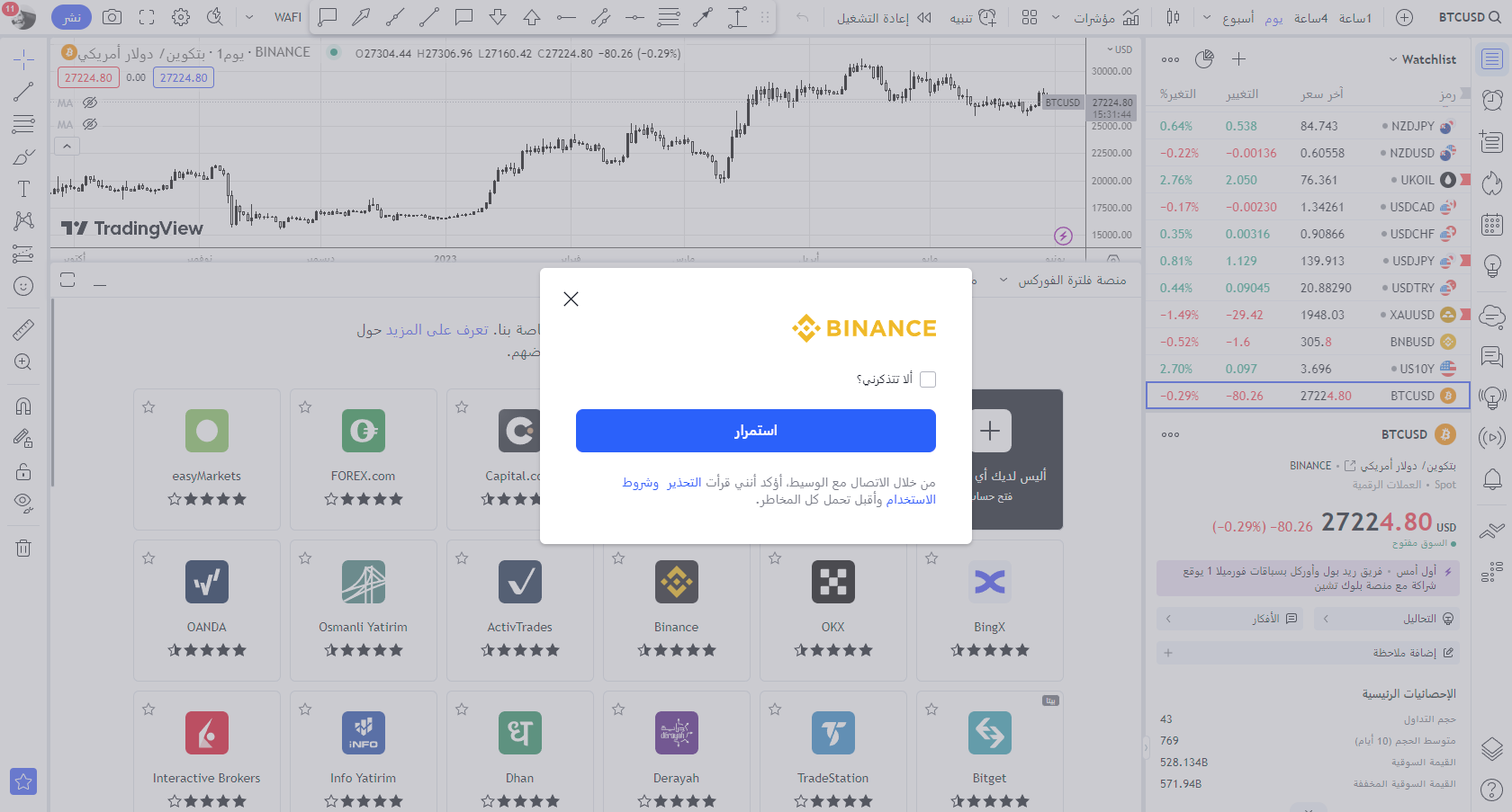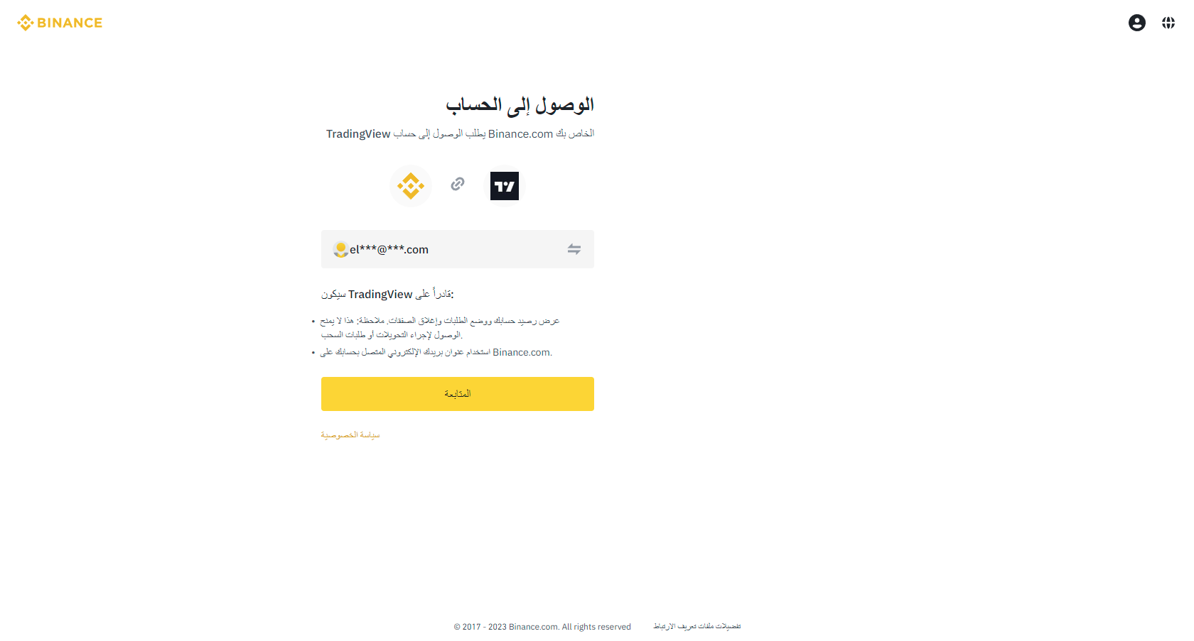سوف تنقل على موقع منصة بينانس لتسجيل الدخول إلى الحساب. ومنح الترخيص لمنصة ترادينج فيو للوصول والارتباط بحسابك مع بينانس.