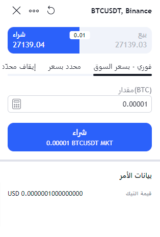 لفتح صفقة تداول، انقر على ايقونة "لوحة الأوامر" في الزاوية اليمنى السفلية. لتظهر لك نفادة فتح أوامر التداول.