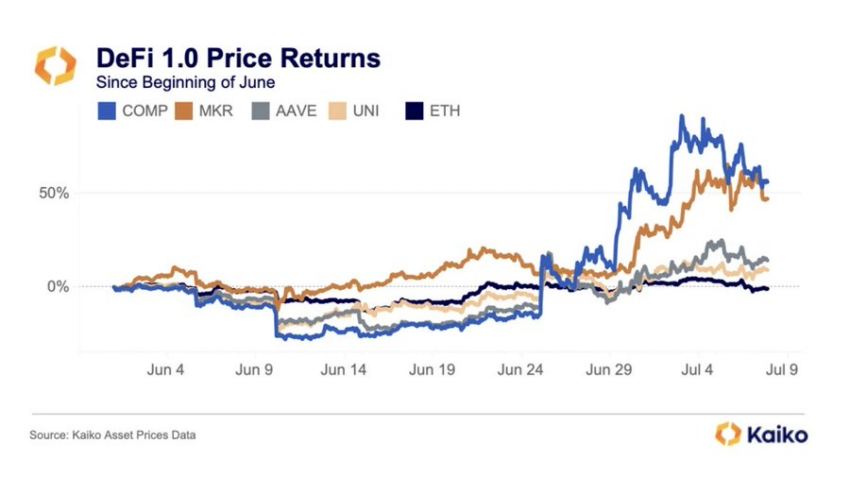 ويشير التداول عادة إلى تحرك الأموال بصورة ذكية. ولكن ذلك يسلط الضوء أيضًا على مدى جودة أداء عملات منصات التمويل اللامركزي خلال الشهر الماضي. وفي العاشر من يوليو، أفادت شركة Kaiko المتخصصة في تحليلات البلوك تشين أن عملات DeFi قد حققت أداءً فائقاً خلال الشهر الماضي.