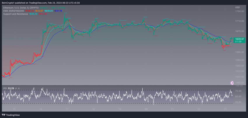 لكن انخفض سعر ETH في 21 فبراير حيث وصل إلى أدنى قيمة له في اليوم عند 1603 دولار. فيما حاول الدببة إلى سحب السعر تحت المتوسط المتحرك البسيط لـ 50 يومًا (1550 دولارًا). ثم صباح اليوم الخميس تمكن الثيران من رد اتجاه السعر للأعلى. حيث يتم تداول الأصل وقت كتابة هذا المقال عند 1640 دولار.