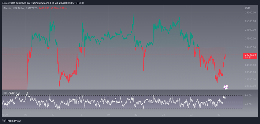 بعد رفض اختراق المقاومة عند 25 ألف دولار في 21 فبراير. حاول المضاربون على الارتفاع على المدى القصير الحفاظ على أرباحهم. مما سحب السعر تحت المتوسط المتحرك الأسي EMA لـ 20 يوما عند 23965 دولار.