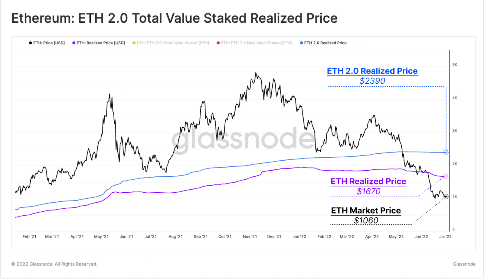 ووفقًا لتقرير صادر عام 2022 بواسطة شركة Glassnode، تم شراء جزء كبير من الإيثيريوم المكدس بمتوسط سعر يبلغ 2390 دولار. إضافة إلى ذلك، أبرز تقرير منصة Coinmarketcap الأحدث أيضًا أن 68% من الإيثر المُكدس في تذبذب.