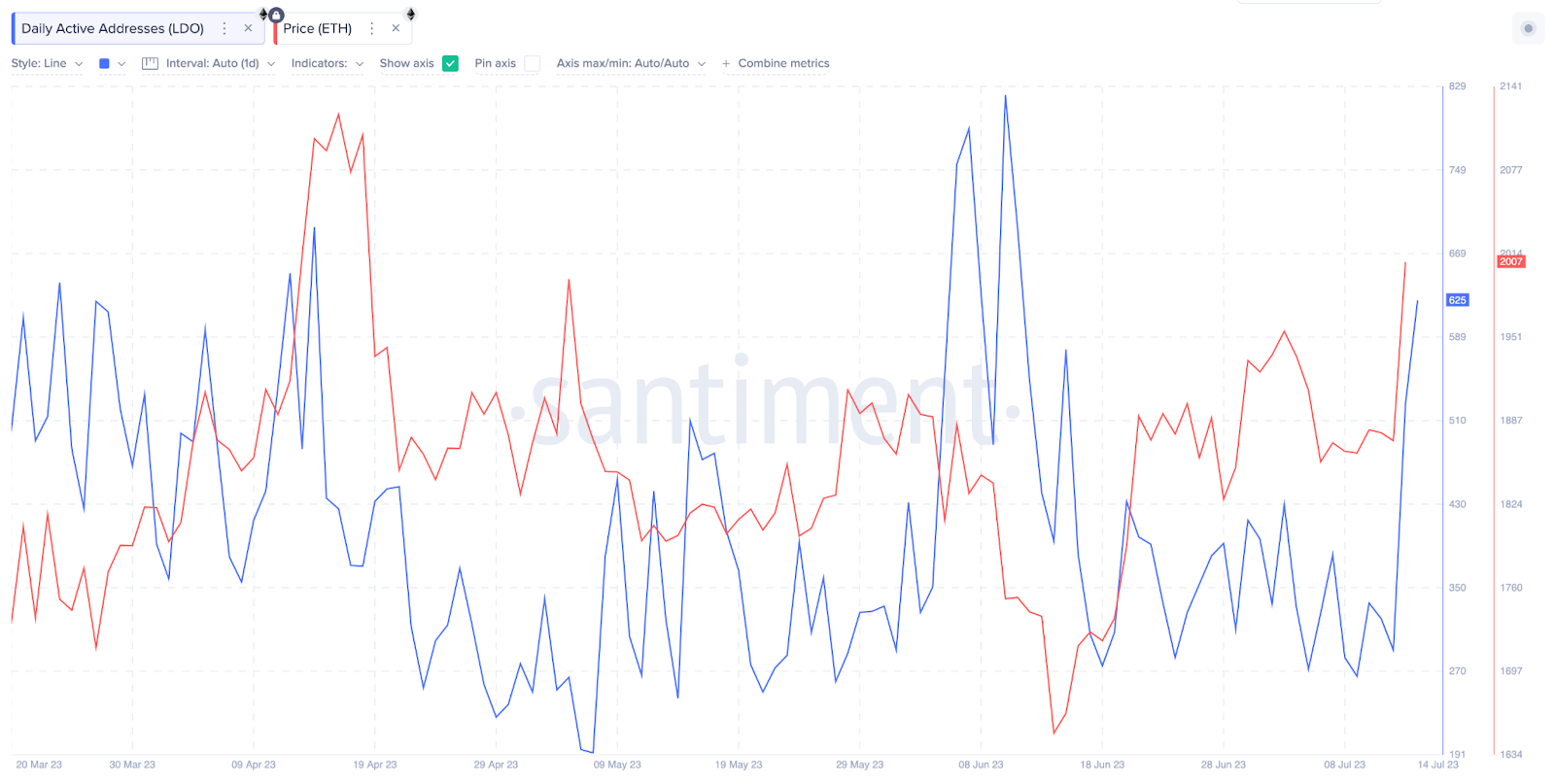 ومن الجدير بالذكر أن سعر الإيثر قد ارتفع بنسبة 22% في الفترة بين 14 يونيو و14 يوليو. وكما هو موضح في الرسم البياني أدناه، بدأ نشاط العناوين اليومية داخل مجمع  LidoDAO أيضًا في الارتفاع في نحو 16 يونيو. ونظرًا لارتفاع سعر الاصل المشفر فوق 2000 دولار، ارتفع نشاط مستخدمي LDO بنسبة 126% للوصول إلى 625 مستخدماً نشطاً يومياً.