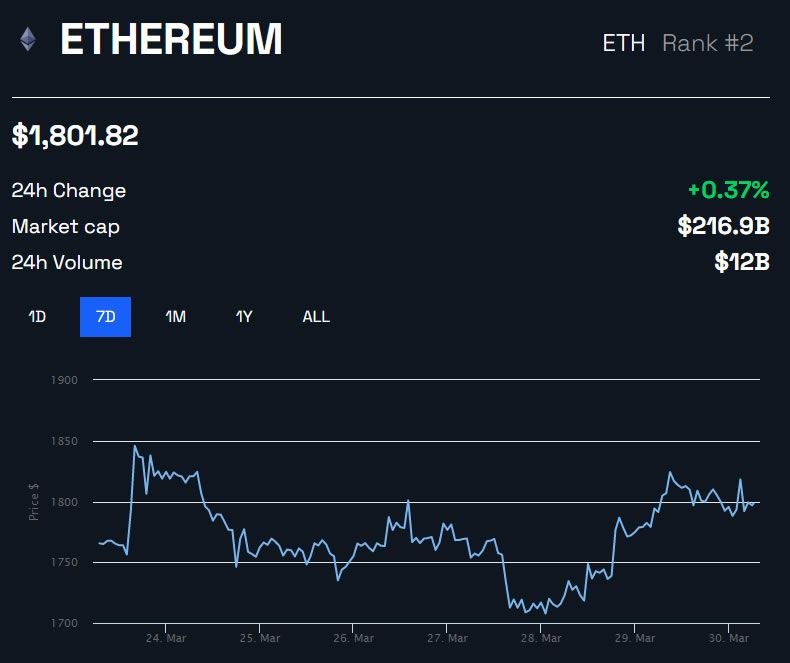 وفي سياق متصل لم تتغير أسعار ETH خلال اليوم الماضي، ولكن استعاد الأصل سعر 1800 دولار وقت كتابة هذا الخبر.
