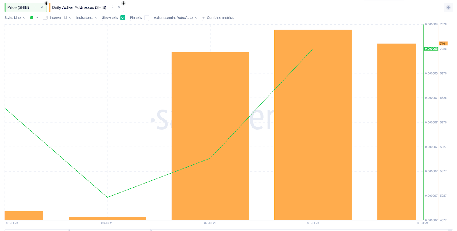 ويوضح مخطط Santiment أدناه كيفية ارتفاع العناوين اليومية النشطة لعملة SHIB من 5009 إلى 7401. ذلك في الفترة بين 5 يوليو و 10 يوليو.