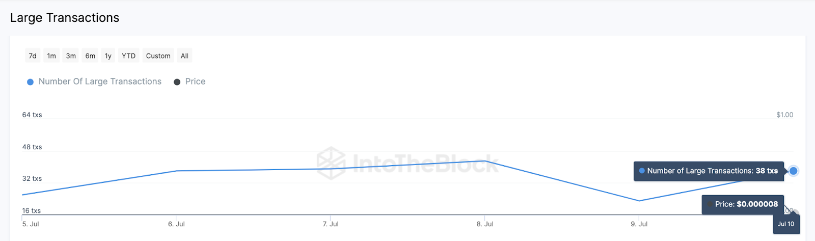 وتظهر بيانات منصة IntoTheBlock أدناه 26 معاملة لحيتان الشيبا في 6 يوليو. ولكن بنهاية 10 يوليو، زادت إلى 38 صفقة قام بها الحيتان.