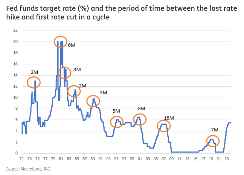 يظهر الرسم البياني أدناه المدة بين آخر رفع للمعدل وأول خفض له منذ السبعينيات. من المثير للاهتمام أن متوسط هذه الفترات يمكن تقريبه إلى 6 أشهر. اليوم يصادف بالضبط 6 أشهر منذ آخر رفع للجنة الفيدرالية لمعدل الفائدة الفيدرالية.