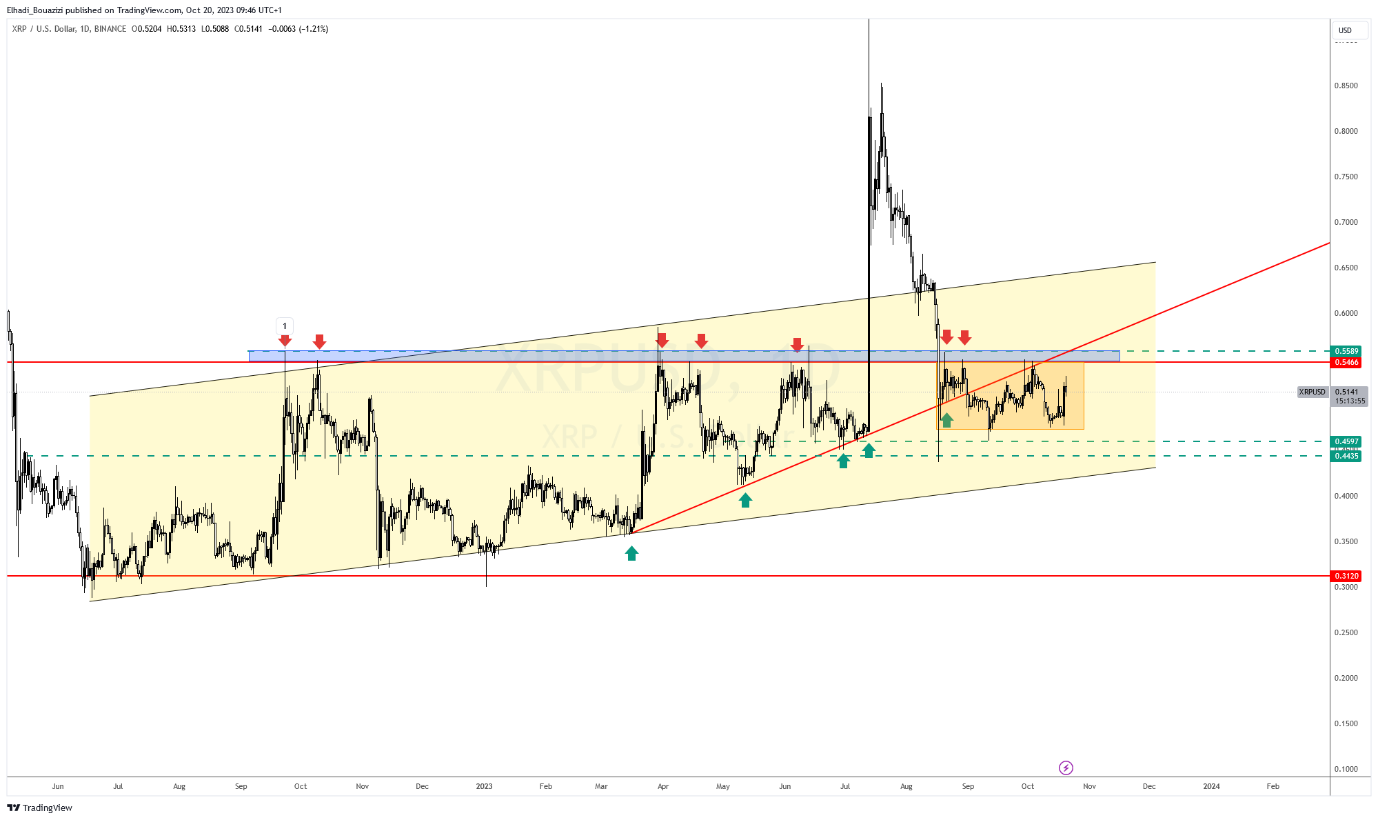 مادام سعر ريبل XRP لم يتمكن من اختراق مستوى منطقة المقاومة القوية جدا عند 0.54 – 0.55 دولار. فإن فرص الارتفاع تبقى ضئيلة. و ن المحتمل جدا أن يبقى السعر يتحرك في النطاق العرضي حتى تنتهي هذه القضية بقرار نهائي حاسم.