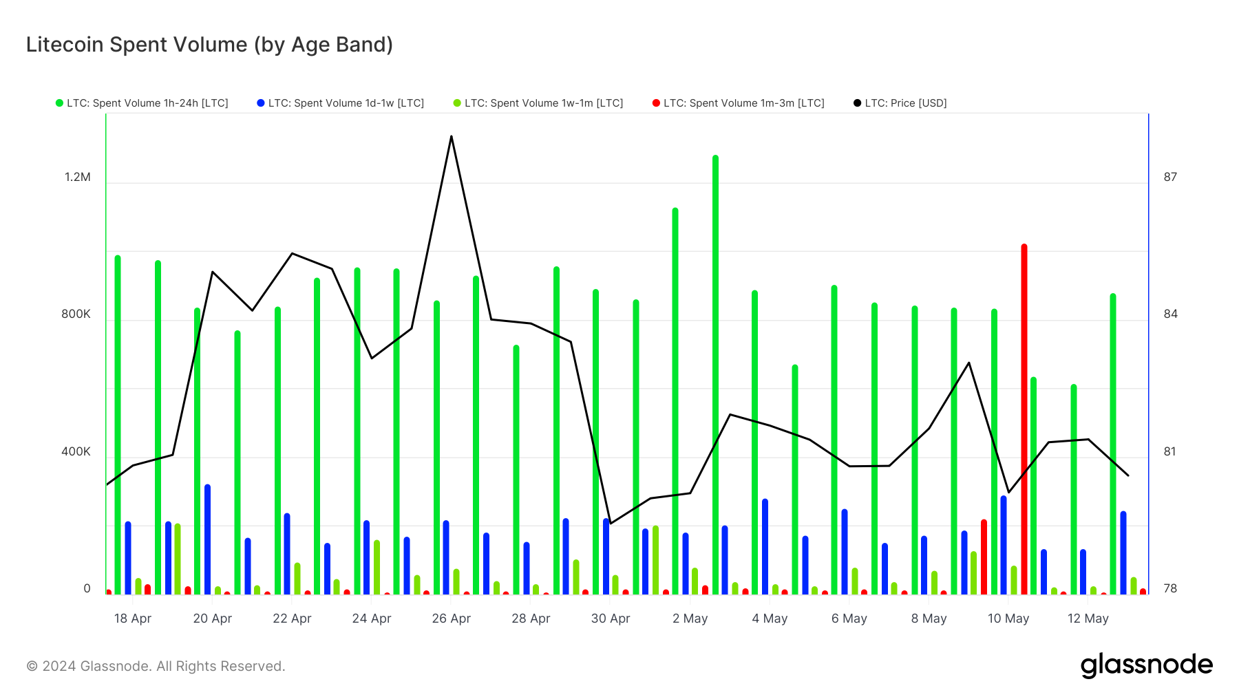 وتعرض المخططات المقدمة النواتج المنفقة مقسمة حسب الفئات العمرية. تمثل الأشرطة الخضراء LTC المحتفظ بها لمدة ساعة واحدة إلى 24 ساعة قبل إنفاقها، وتشير الأشرطة الزرقاء إلى LTC المحتفظ بها لمدة يوم واحد إلى أسبوع واحد قبل إنفاقها، وتظهر الأشرطة الخضراء الفاتحة LTC المحتفظ بها لمدة أسبوع إلى 1 شهر قبل إنفاقها، وتعكس الأشرطة الحمراء LTC المحتفظ بها لمدة شهر واحد إلى 3 أشهر قبل إنفاقها. يمثل الخط الأسود سعر LTC بالدولار الأمريكي.