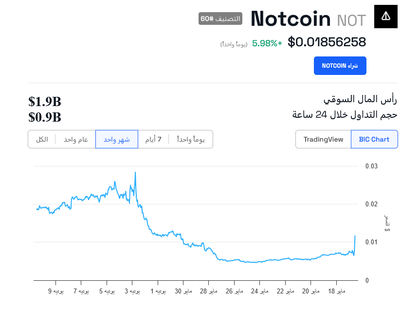 وتداولت عملة "نوت كوين" (NOT) عند سعر 0.0185 دولار، بزيادة 5% خلال 24 ساعة الماضية، وارتفاع مذهل بنسبة 210% خلال الأسبوعين الماضيين، وفقًا لبيانات "كوين جيكو" (CoinGecko).