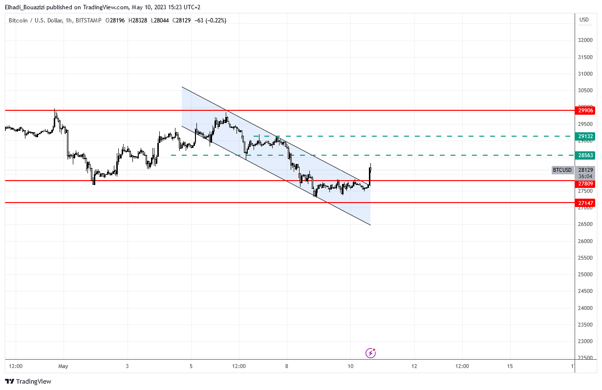 على المدى القصير، مستوى المقاومة التالي موجود عند 28563 دولار ثم 29132 دولار قبل الوصول إلى مستوى المقاومة الرئيسي عند 29900 دولار.
