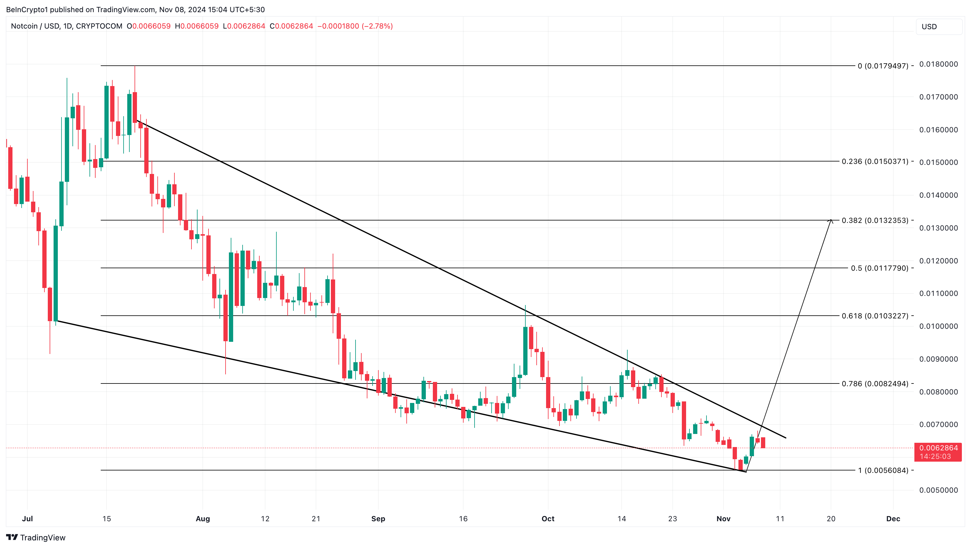 حتى وقت كتابة هذا التقرير، بلغ سعر نوتكوين 0,0063 دولار، مما يمثل انخفاضًا بنسبة 16,69% خلال آخر 24 ساعة. على الرغم من الانخفاض، شكلت NOT نمط الوتد الهابط على الرسم البياني اليومي.