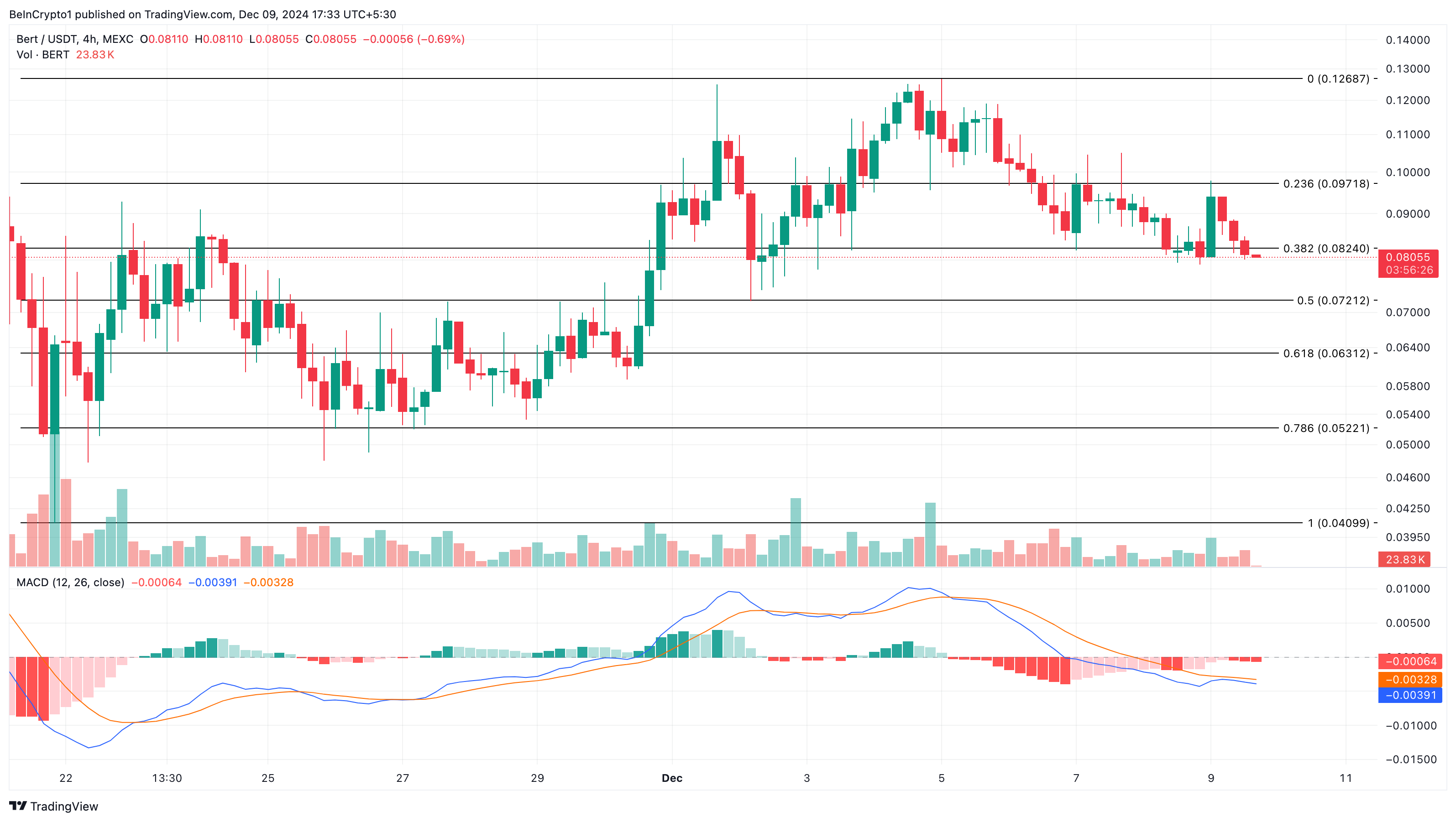 يشير الانخفاض في قراءة MACD إلى زخم هبوطي حول الرمز. لذا، من المحتمل أن ينخفض سعر BERT. إذا كان هذا هو الحال، فمن المحتمل أن ينخفض BERT إلى $0,063. ومع ذلك، إذا دخل ضغط الشراء في اللعب، فقد لا يحدث ذلك، ويمكن أن يرتفع الرمز إلى $0,13.