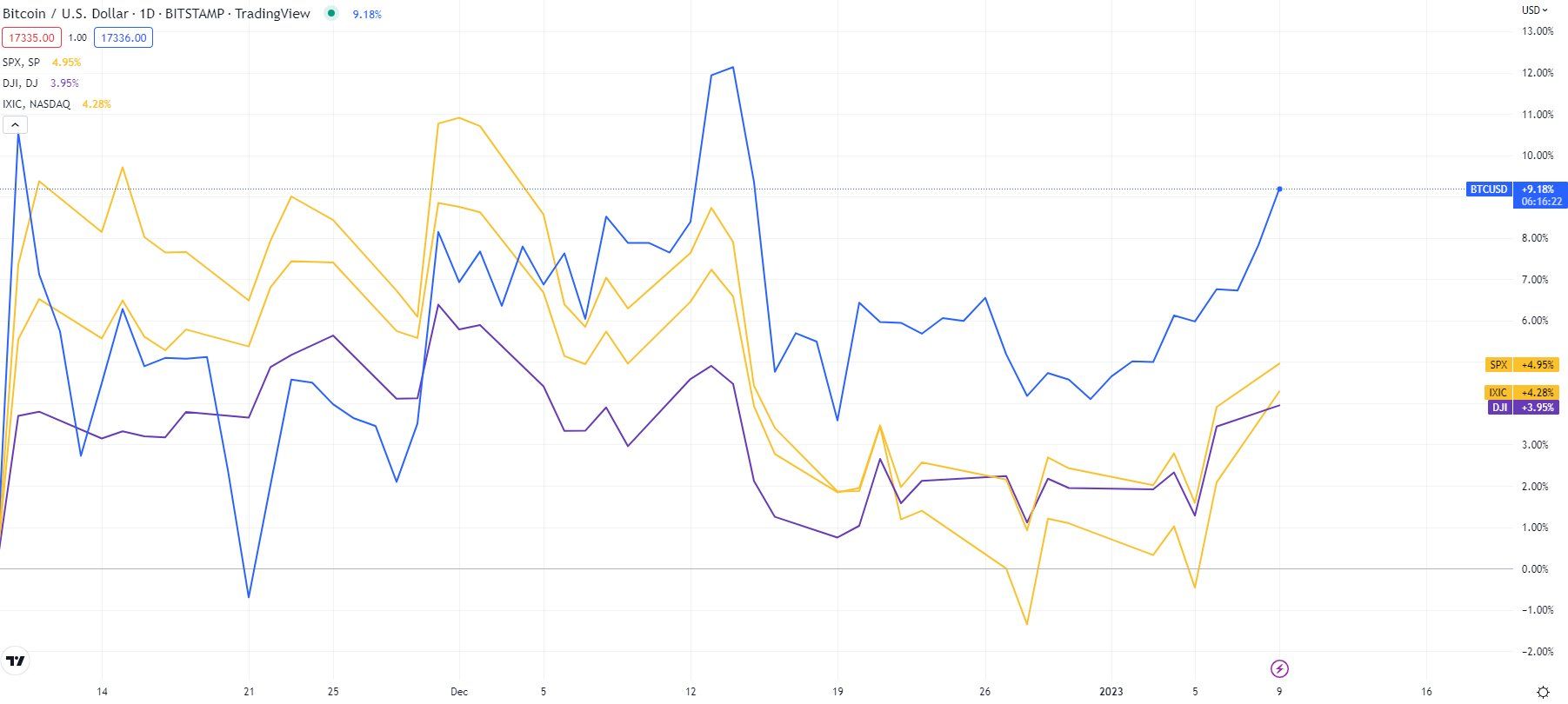 وقد صار لون سوق الأسهم أخضراً بعد أن سجل مؤشرا Dow و S&P 500 أفضل الأسابيع أداءً منذ شهر نوفمبر من العام الماضي، وبحسب ما ذكرته منصة كوين تليغراف، فقد ترتبط حركة أسعار البتكوين BTC بحركة الأسهم الأمريكية فلا يمثل ارتفاع هذا اليوم استثناء عن الارتفاعات السابقة.
