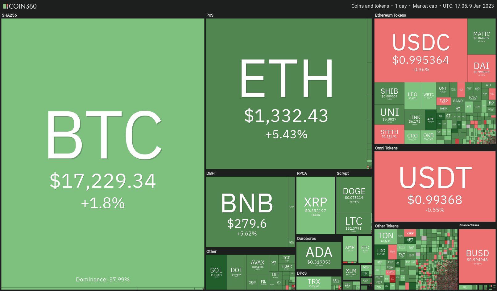 صاحب ارتفاع سعر عملة البتكوين BTC في التاسع من يناير، ارتفاع شامل في أسعار العملات الرقمية ما نتج عنه تزايد آمال المستثمرين في الوصول إلى أعلى سعر للعملة عند نطاق 17348 دولار وليكون ذلك علامة على وصول البتكوين BTC عند القاع.