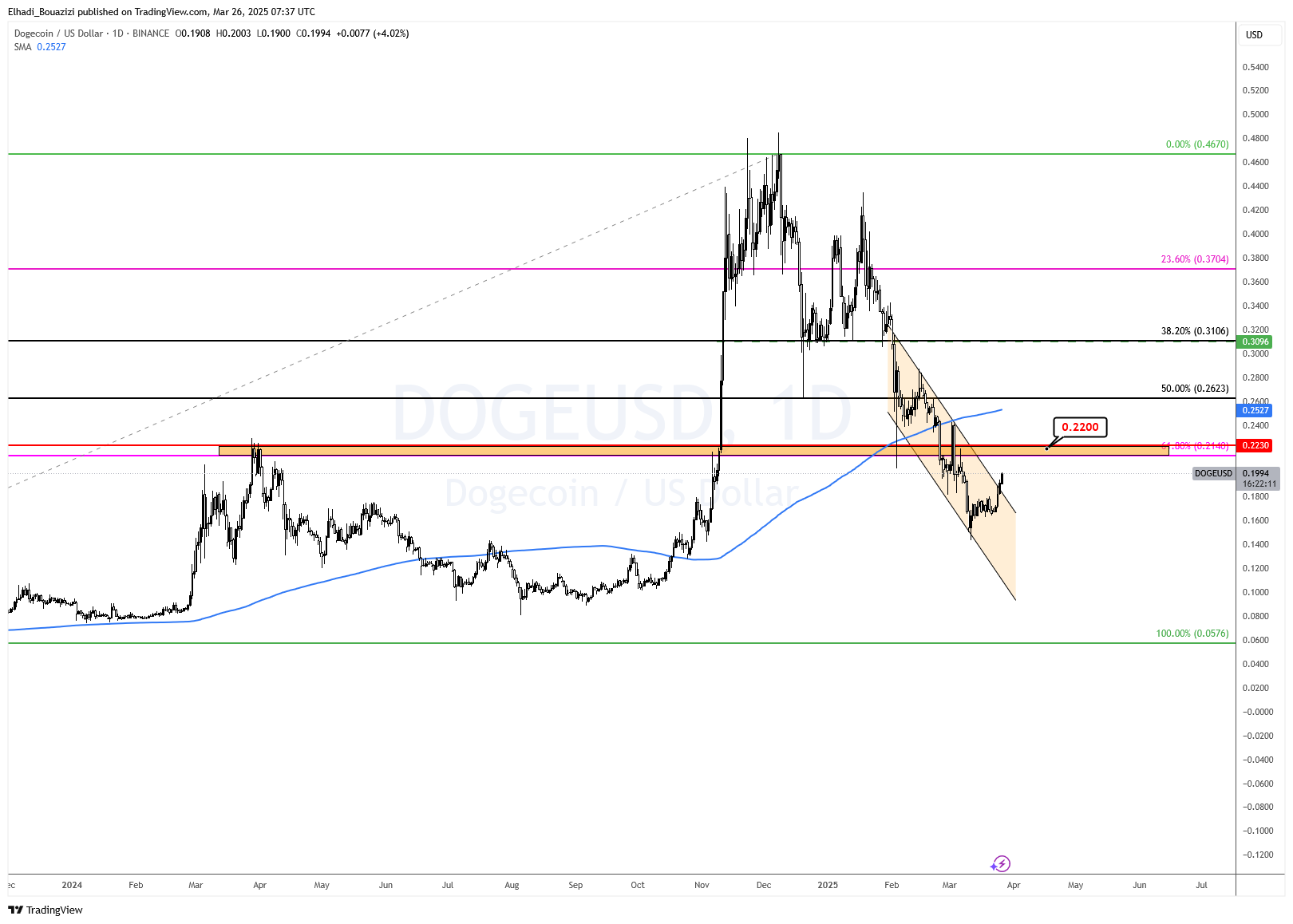 كما يقترب السعر من المتوسط المتحرك لـ 200 يوم عند 0.2527 دولار، والذي يشكل عائقًا إضافيًا أمام الصعود.