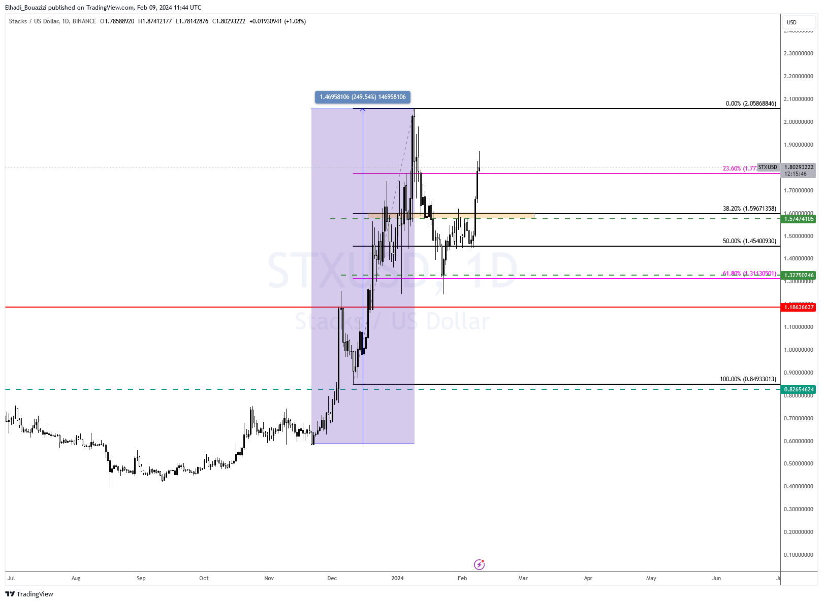 Sponsoredو من هناك عاود رحلة الصعود، و سعر عملة STX الآن يتداول فوق مستوى فيبوناتشي 23.6% عند سعر 1.77 دولار.
