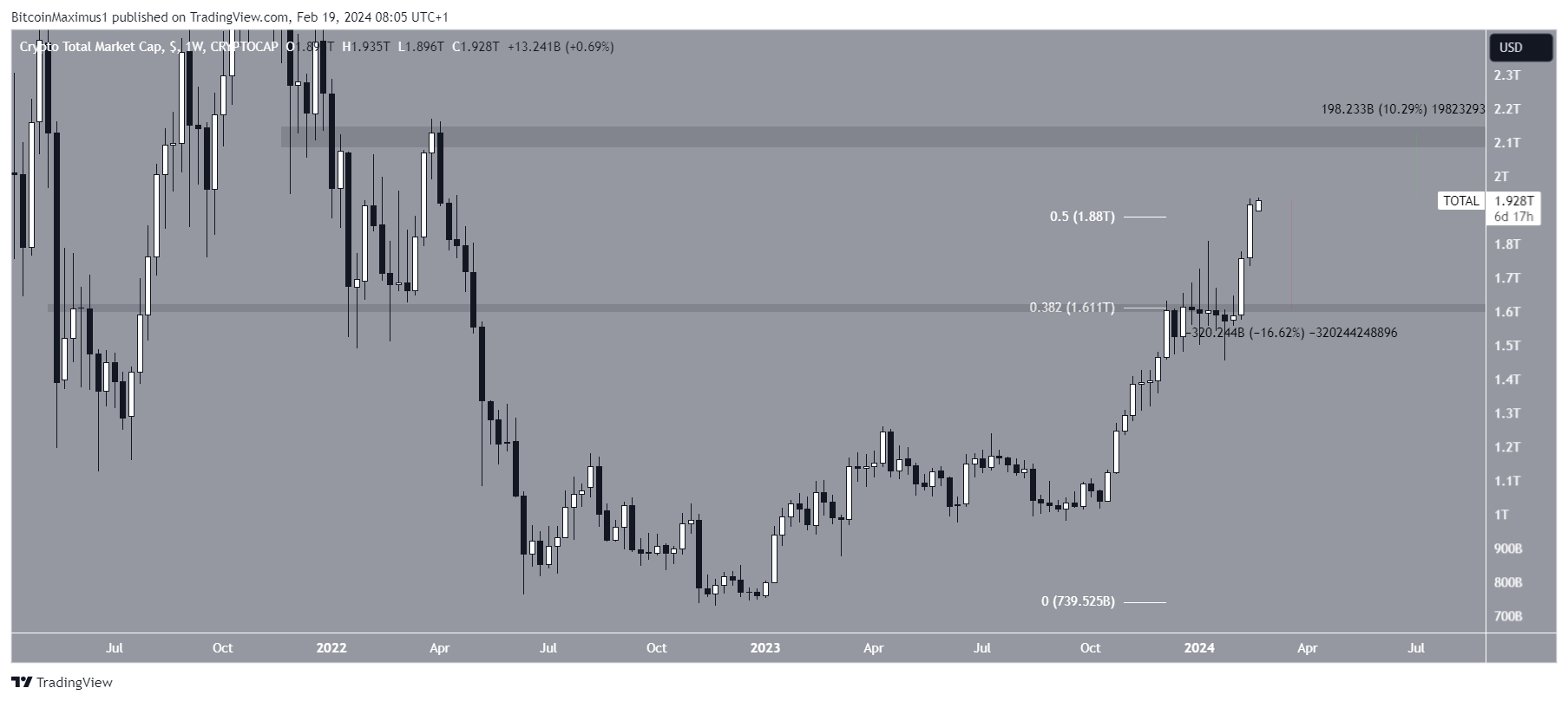بعد التحرك فوق مستوى مقاومة تصحيح فيب 0.382 عند 1.61 تريليون دولار، ارتفعت القيمة السوقية للعملات المشفرة وأغلق فوق مستوى مقاومة تصحيح فيبوناتشي 0.5 عند 1.88 تريليون دولار.