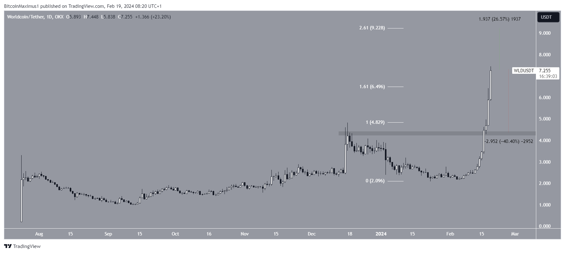 أغلق السعر أيضًا فوق مستوى مقاومة تصحيح فيبوناتشي الخارجي 1.61 عند 6.50 دولار. نظرًا لأن سعر WLD عند أعلى مستوى له على الإطلاق، فإن مستويات تصحيح فيبوناتشي الخارجية مطلوبة لتحديد المقاومة التالية.