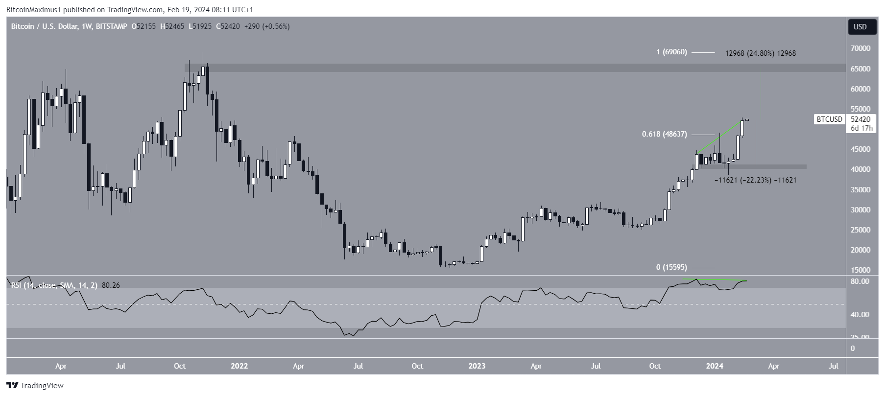 على غرار القيمة السوقية للعملات المشفرة، ارتفعت عملة البيتكوين بشكل كبير في الأسبوعين الماضيين، ووصلت إلى إغلاق فوق مستوى مقاومة تصحيح فيبوناتشي 0.618. وصلت بيتكوين إلى أول إغلاق أسبوعي فوق 50000 دولار منذ ديسمبر 2021.