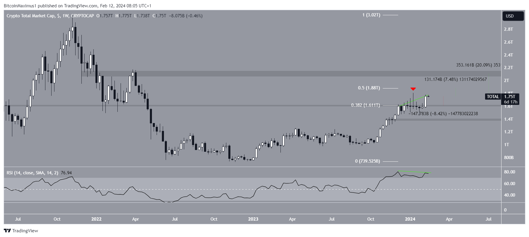 في حالة حدوث انعكاس هبوطي، يمكن أن تنخفض القيمة السوقية للعملات المشفرة بنسبة 8٪ إلى أقرب دعم عند 1.61 تريليون دولار.